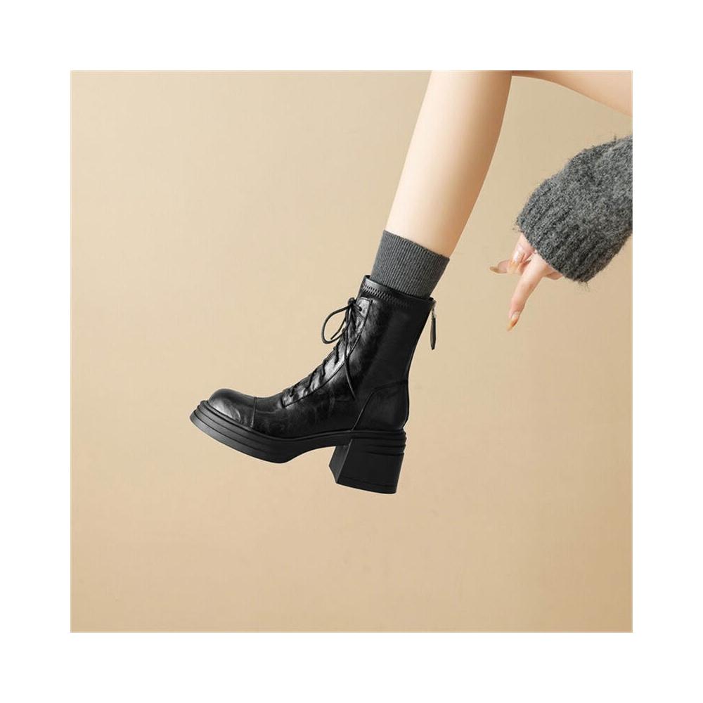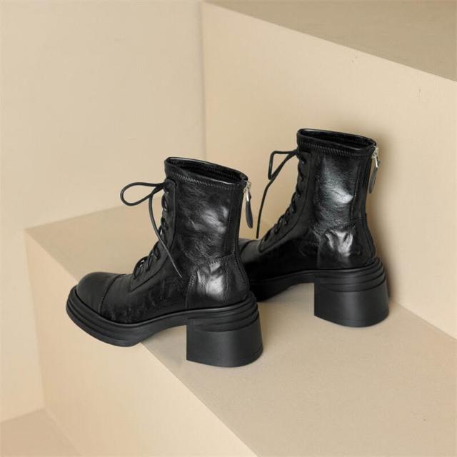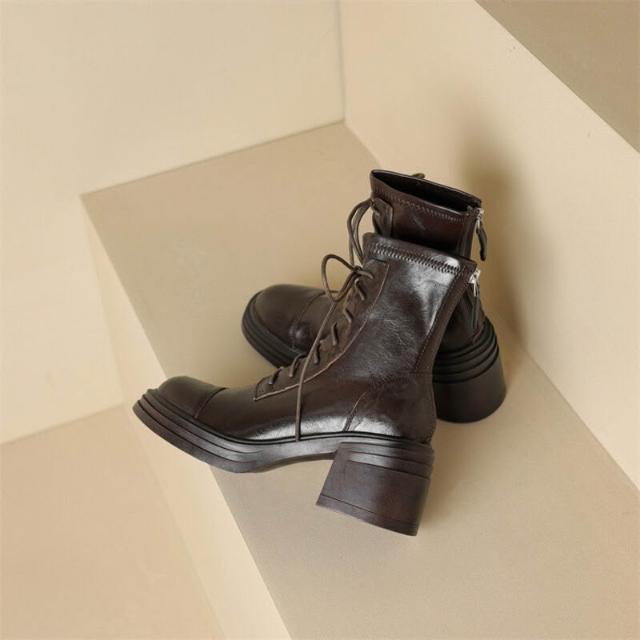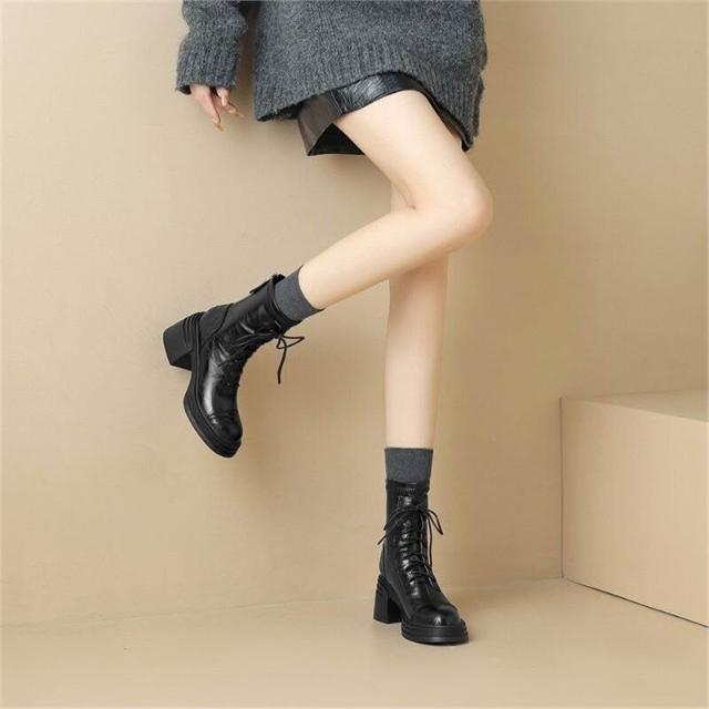 木槿衣坊 牛皮版~高跟馬丁靴女2025秋冬新款粗跟瘦瘦靴英倫風酷飒厚底短靴