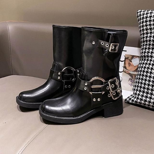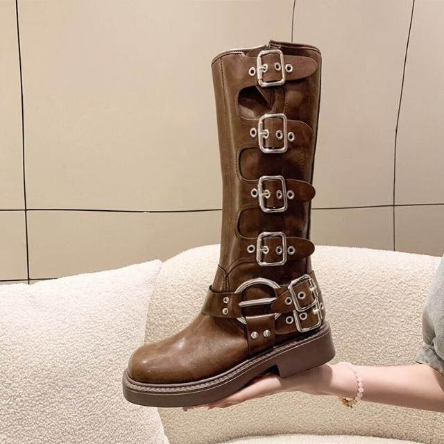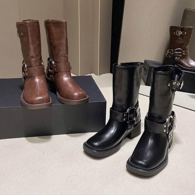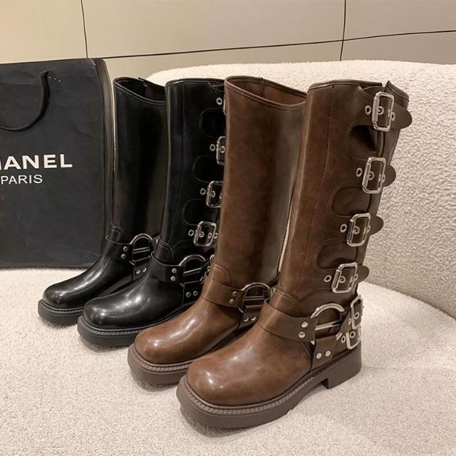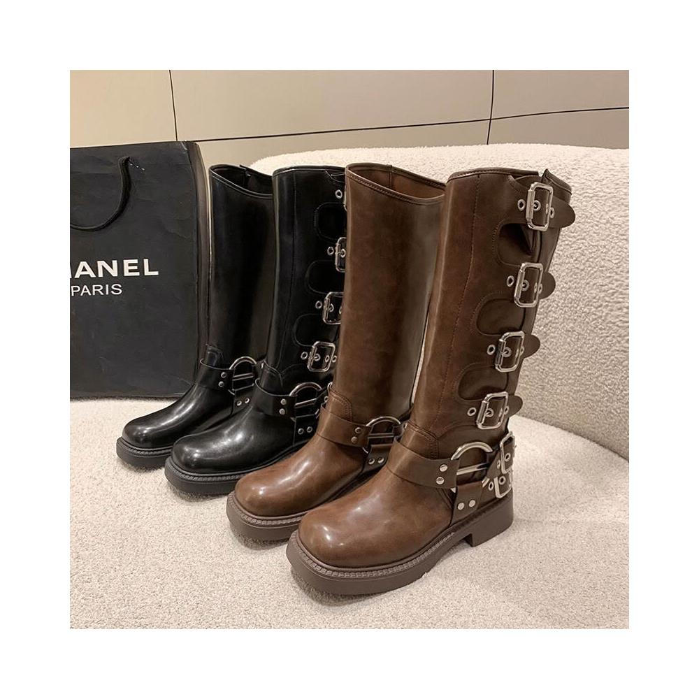 木槿衣坊 旅遊必穿靴子女美式復古馬丁靴棕色高筒靴長筒西部牛仔靴女靴子 0 3