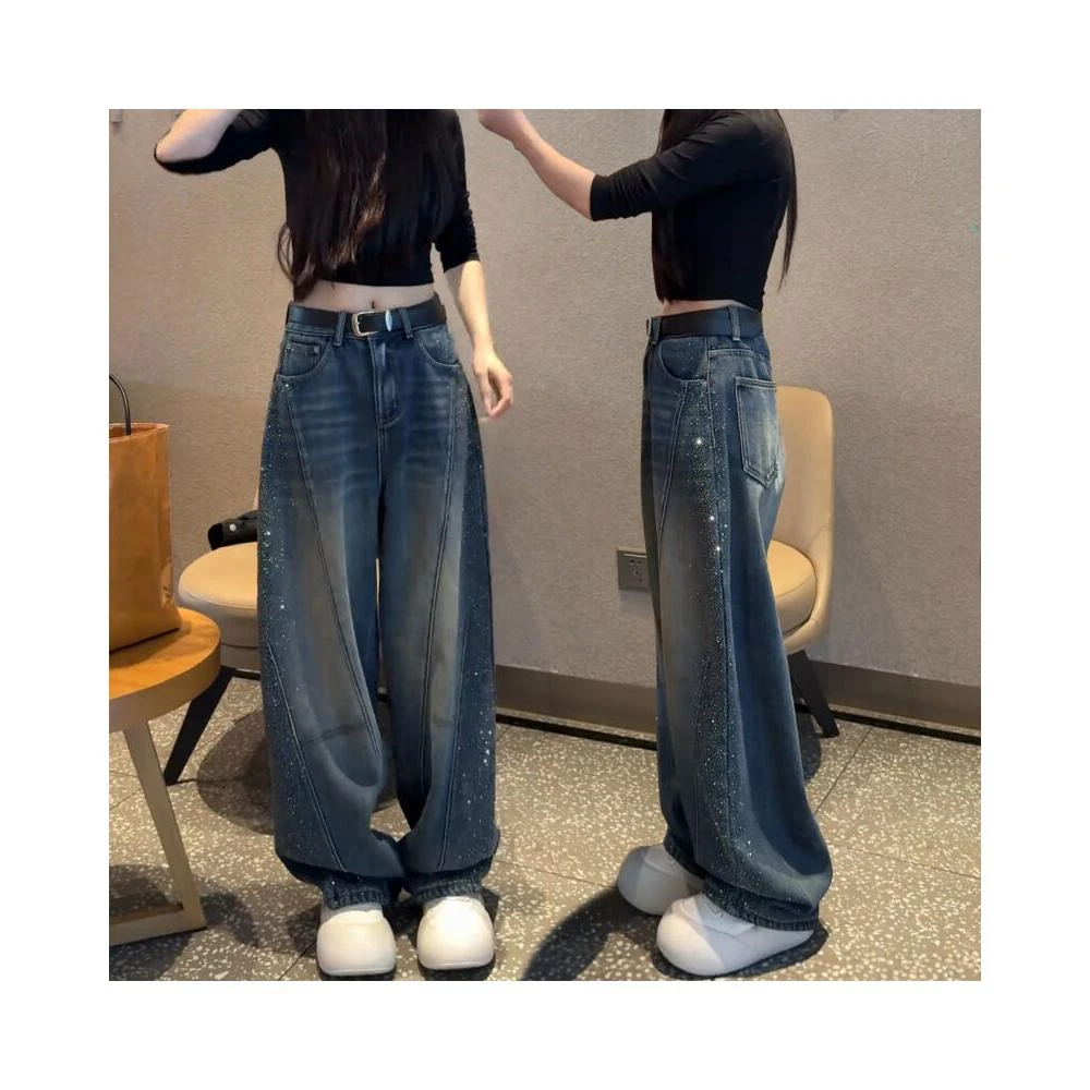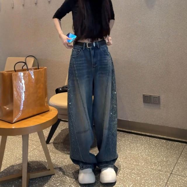 木槿衣坊 滿天星燙鉆彎刀牛仔褲女春季2026新款復古藍闊腿褲大碼胖 直筒褲 74