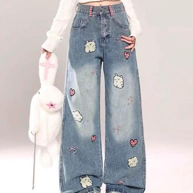木槿衣坊 美式復古卡通愛心刺繡牛仔褲女秋季新款設計感寬松休閑闊腿直筒褲 10