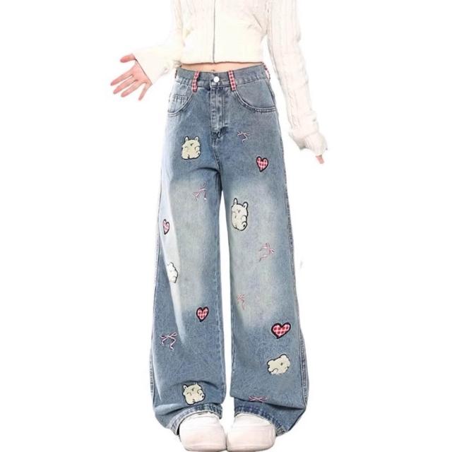 木槿衣坊 美式復古卡通愛心刺繡牛仔褲女秋季新款設計感寬松休閑闊腿直筒褲 10