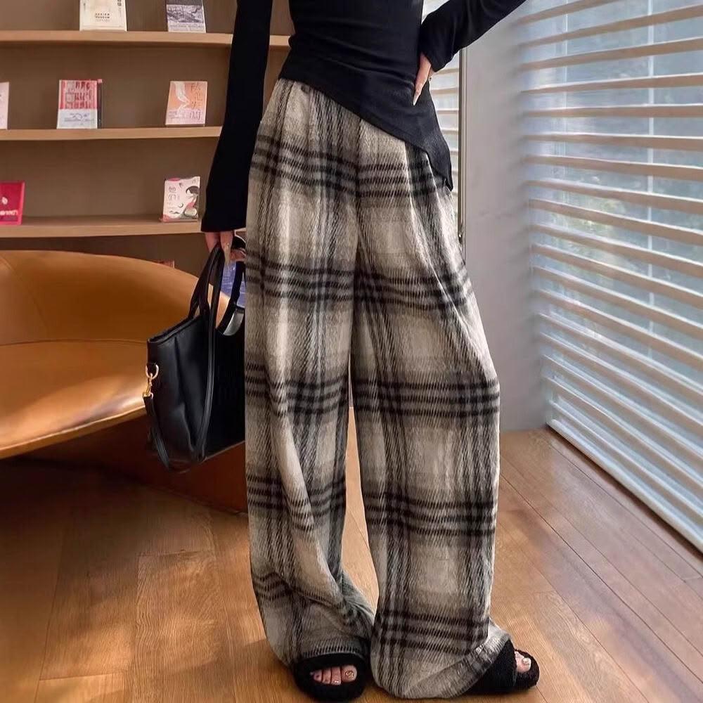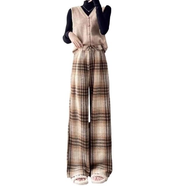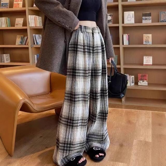 木槿衣坊 復古毛呢格子褲女窄版拖地休閑棉褲慵懶直筒垂感加絨針織微喇褲子 494