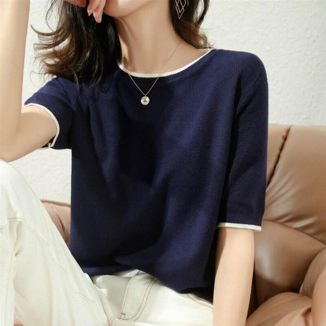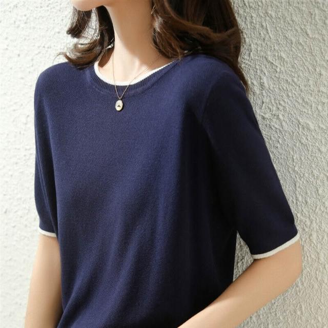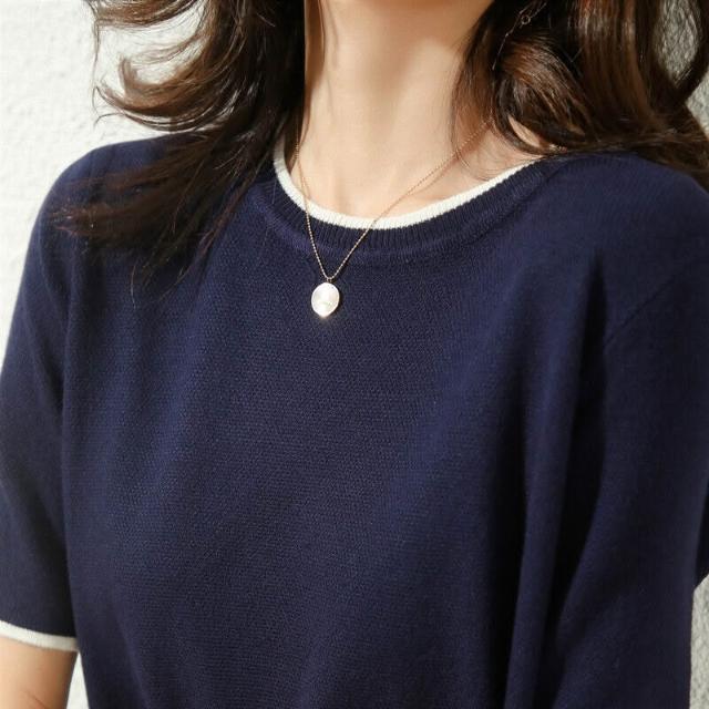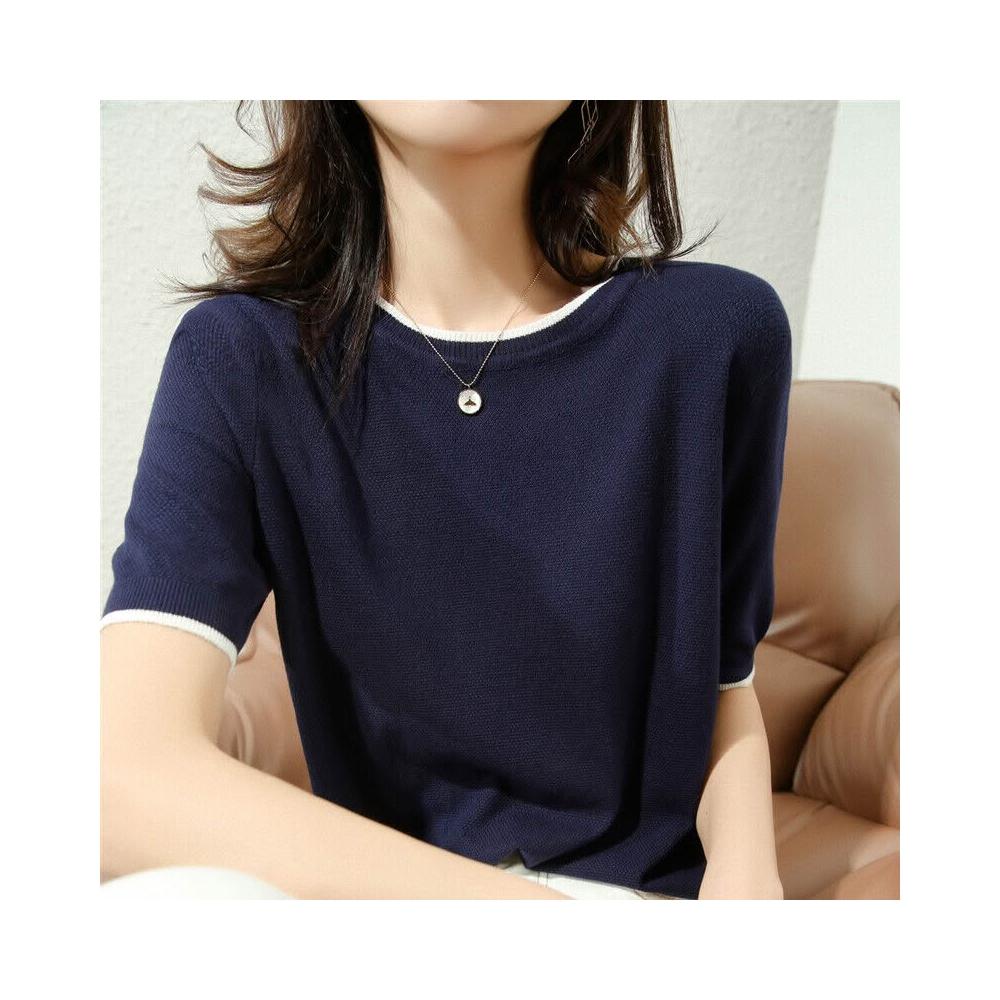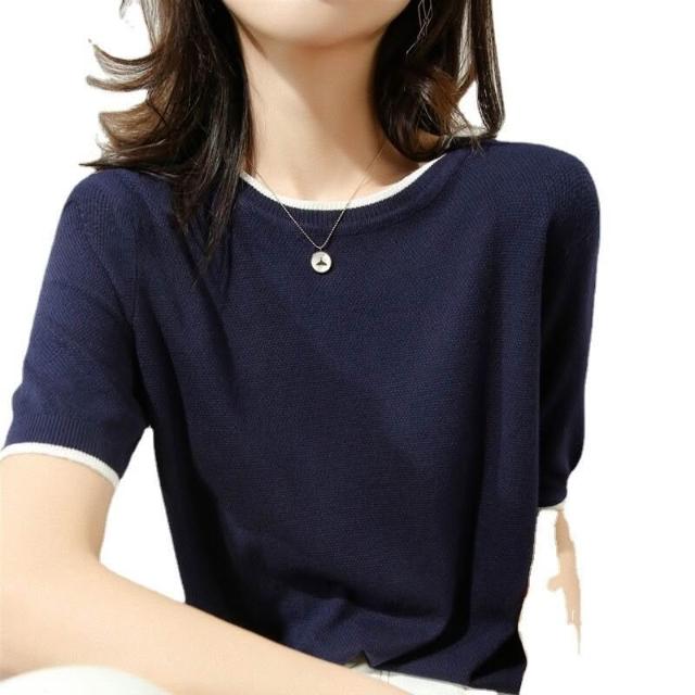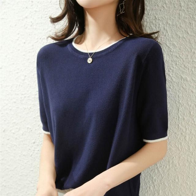木槿衣坊 高品質絲光棉短袖 恤女2023夏季半袖寬松打底衫純棉針織上衣藏藍 78
