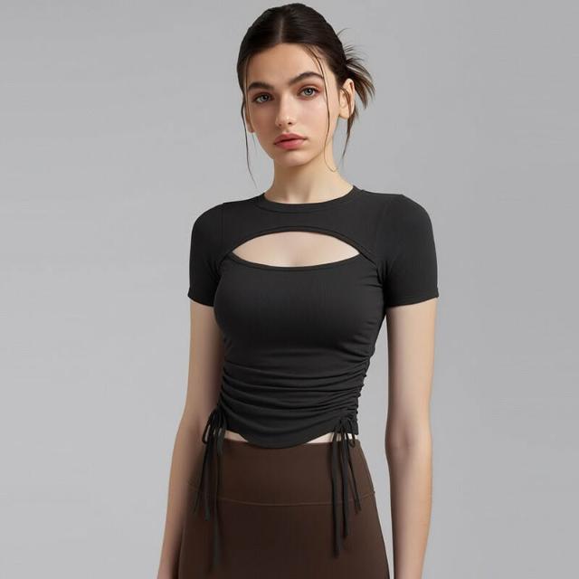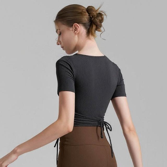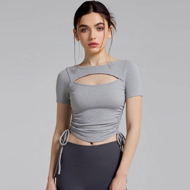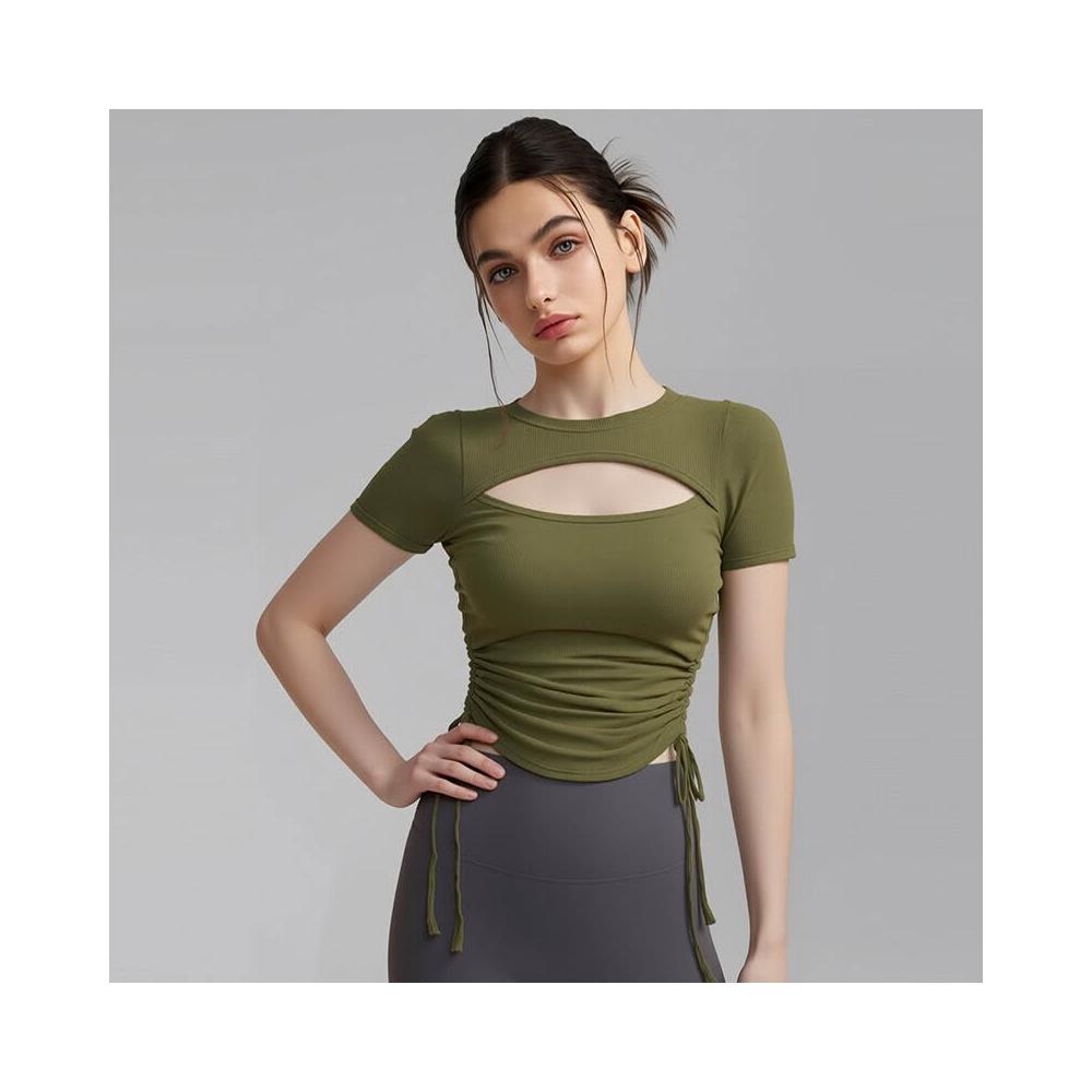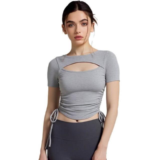 木槿衣坊 瑜伽服女春夏跨境新款針織打底衫運動戶外健身服抽繩短袖 恤上衣 96