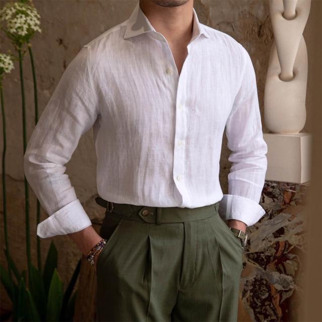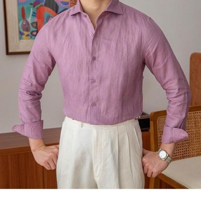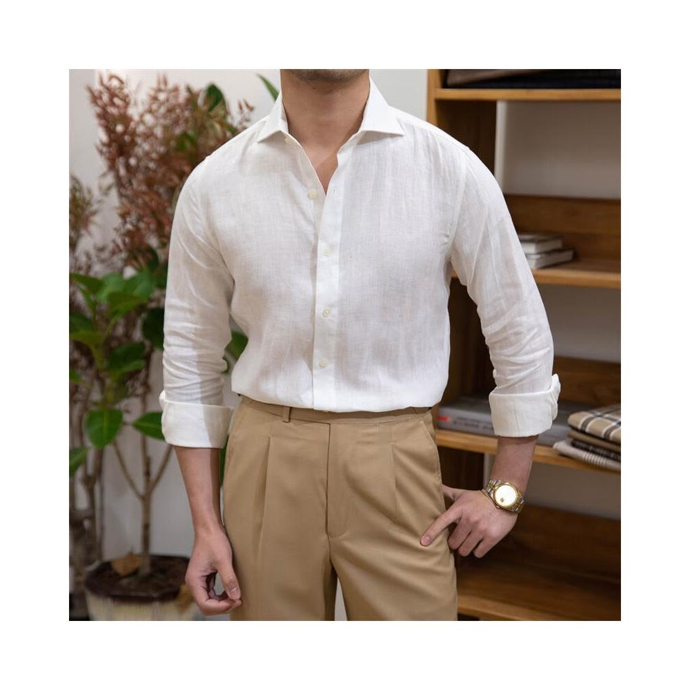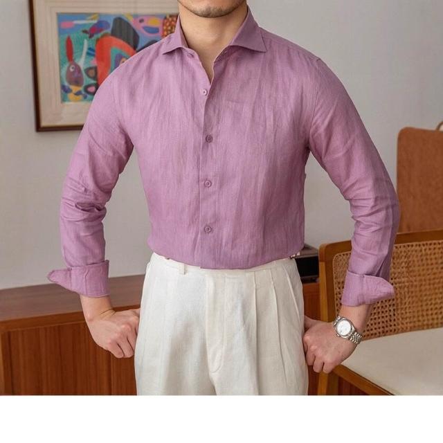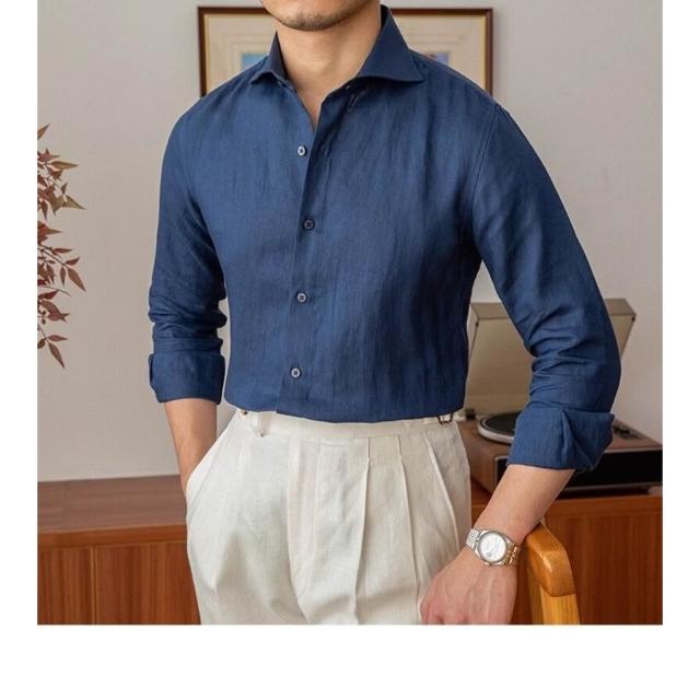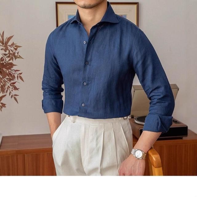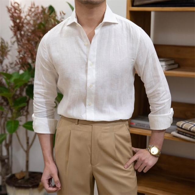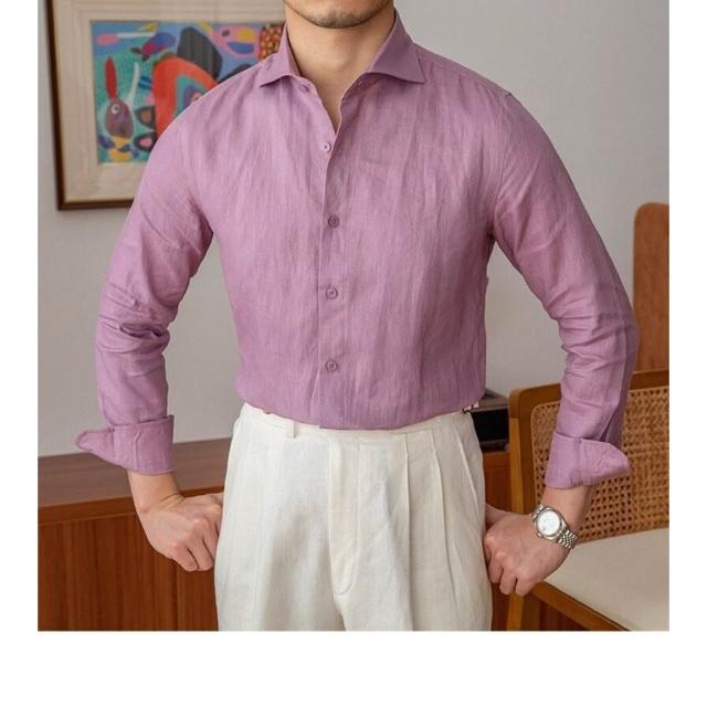 木槿衣坊 夏季薄款時尚長袖溫莎領襯衫透氣純亞麻修身百搭休閑襯衣潮流男 653
