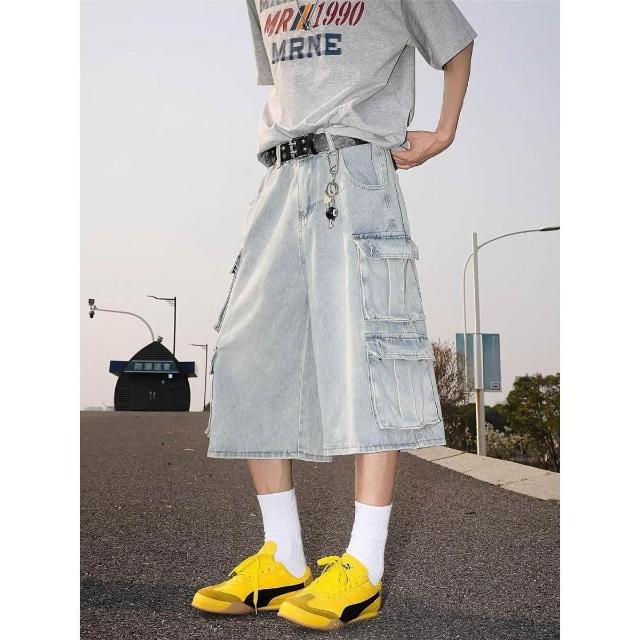 木槿衣坊 美式復古多口袋工裝水洗牛仔短褲男夏季高街嘻哈百搭寬松七分褲潮 5 5