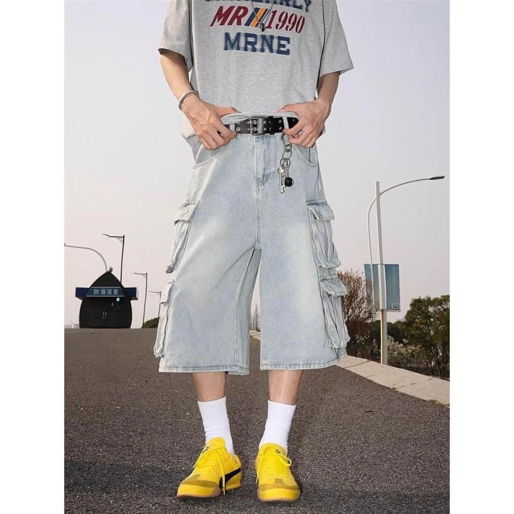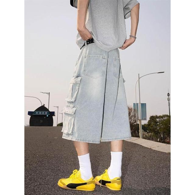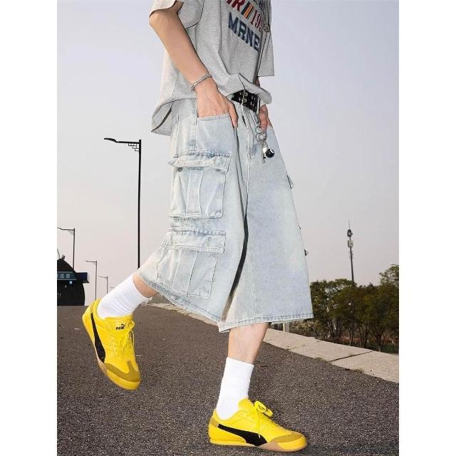 木槿衣坊 美式復古多口袋工裝水洗牛仔短褲男夏季高街嘻哈百搭寬松七分褲潮 5 5