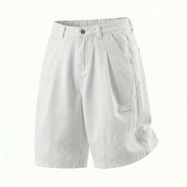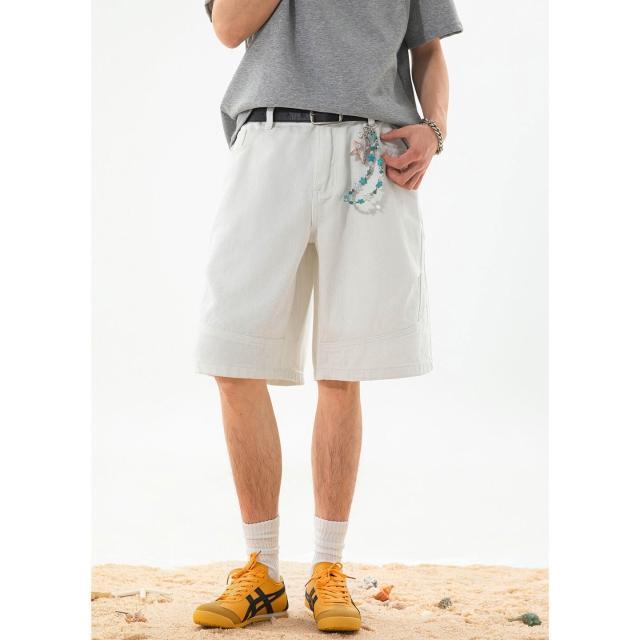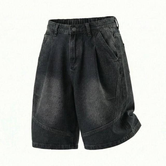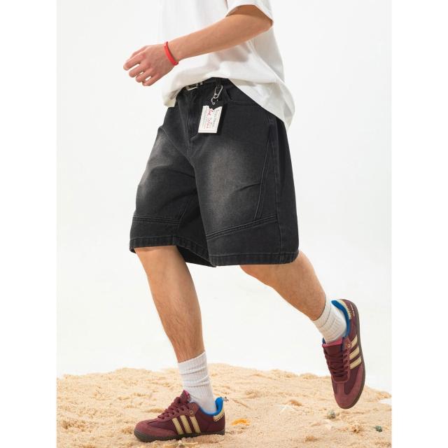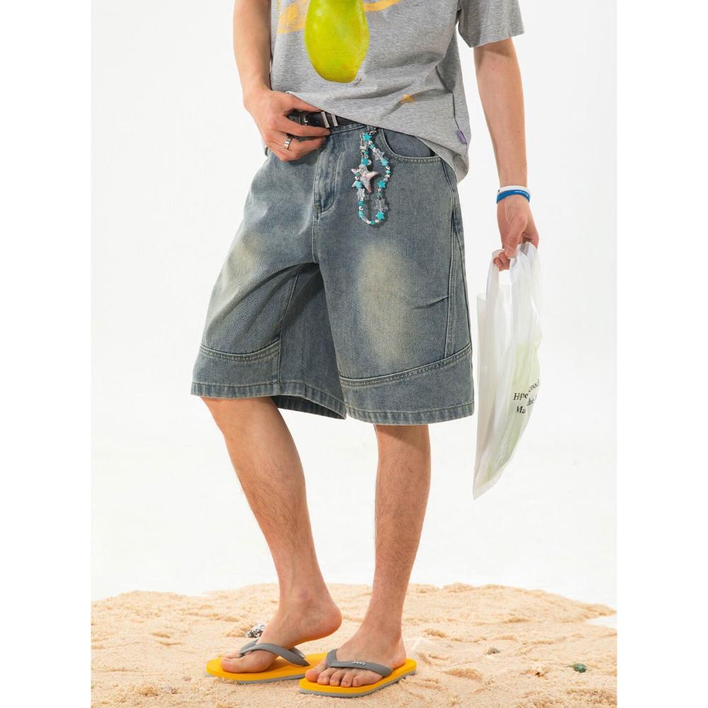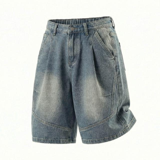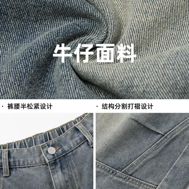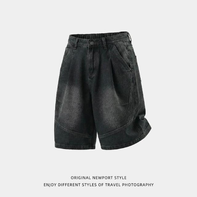 木槿衣坊 美式復古水洗牛仔短褲男夏款分割打褶寬松休閑中褲質感做舊五分褲 6