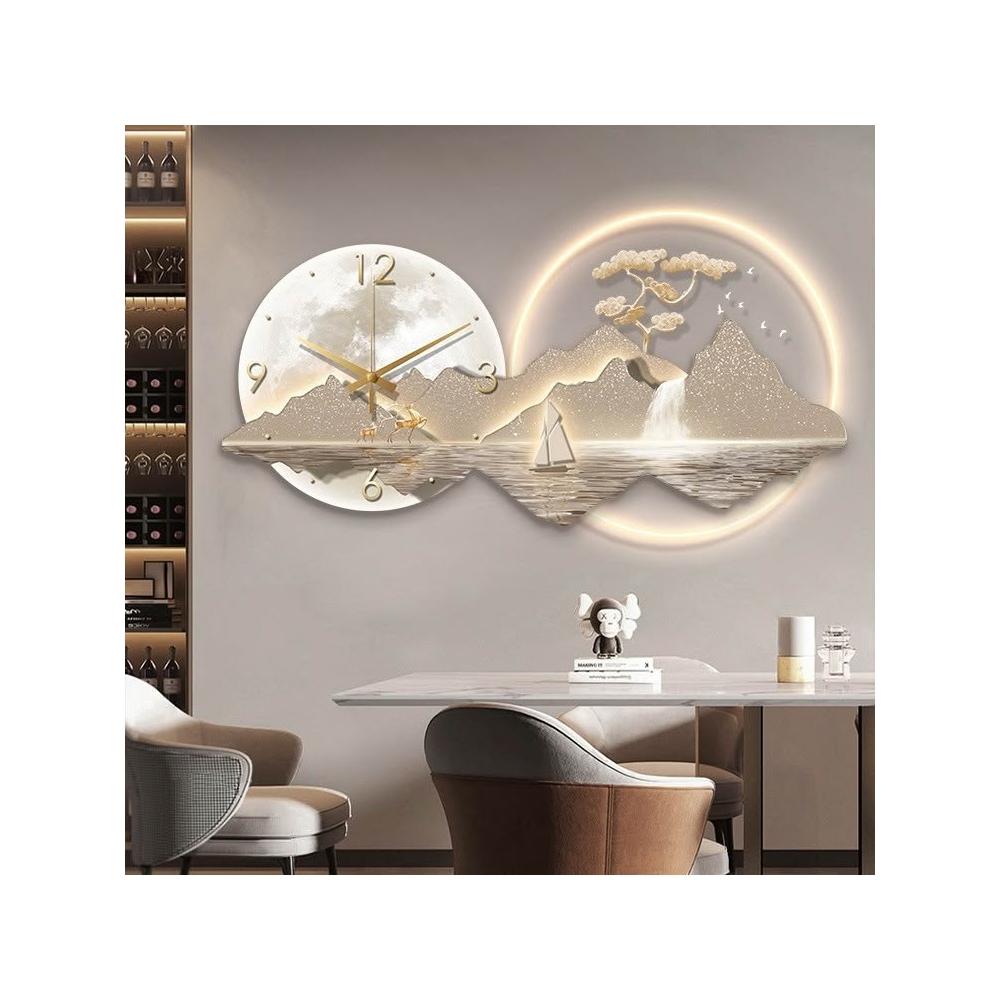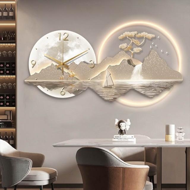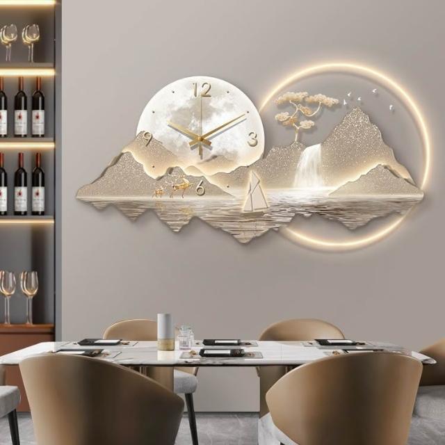 木槿衣坊 日照金山餐廳裝飾畫輕奢高級感大氣飯廳帶時鐘表掛墻客廳創意掛鐘 0