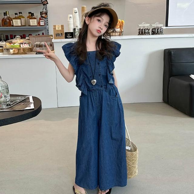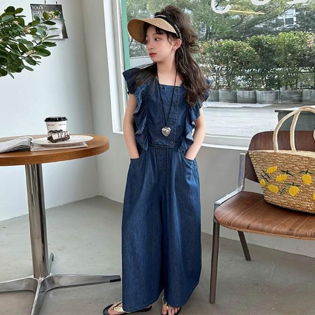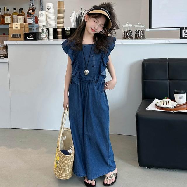 木槿衣坊 女童牛仔套裝2024夏裝兒童飛袖上衣夏季闊腿褲女孩韓系時尚兩件套 081