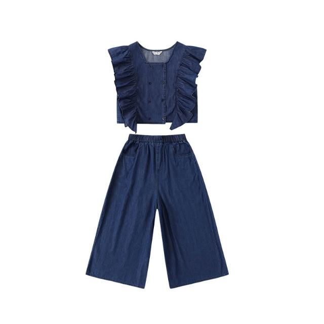 木槿衣坊 女童牛仔套裝2024夏裝兒童飛袖上衣夏季闊腿褲女孩韓系時尚兩件套 081