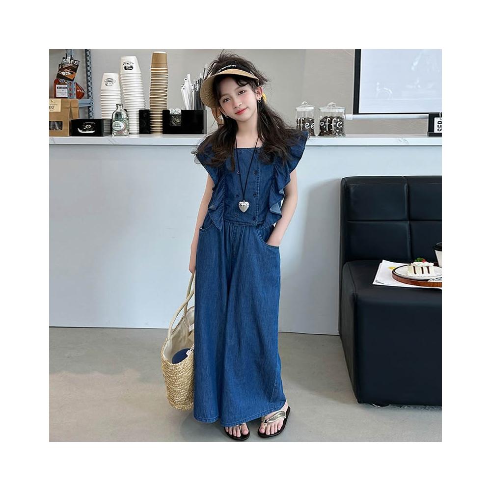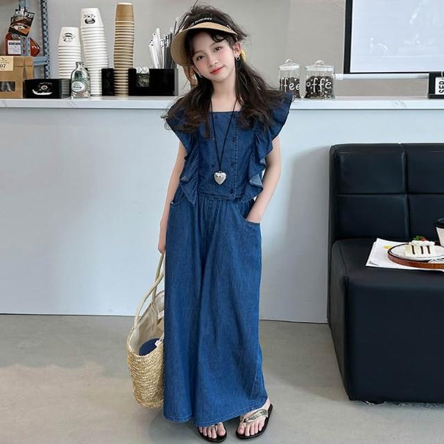 木槿衣坊 女童牛仔套裝2024夏裝兒童飛袖上衣夏季闊腿褲女孩韓系時尚兩件套 081