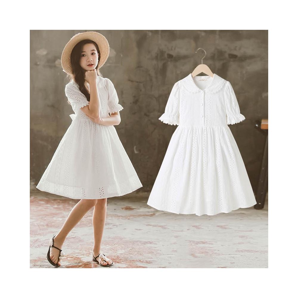 木槿衣坊 夏裝女童連衣裙2026中大童白色娃娃領公主裙紮染白胚全棉兒童裙子 1 7