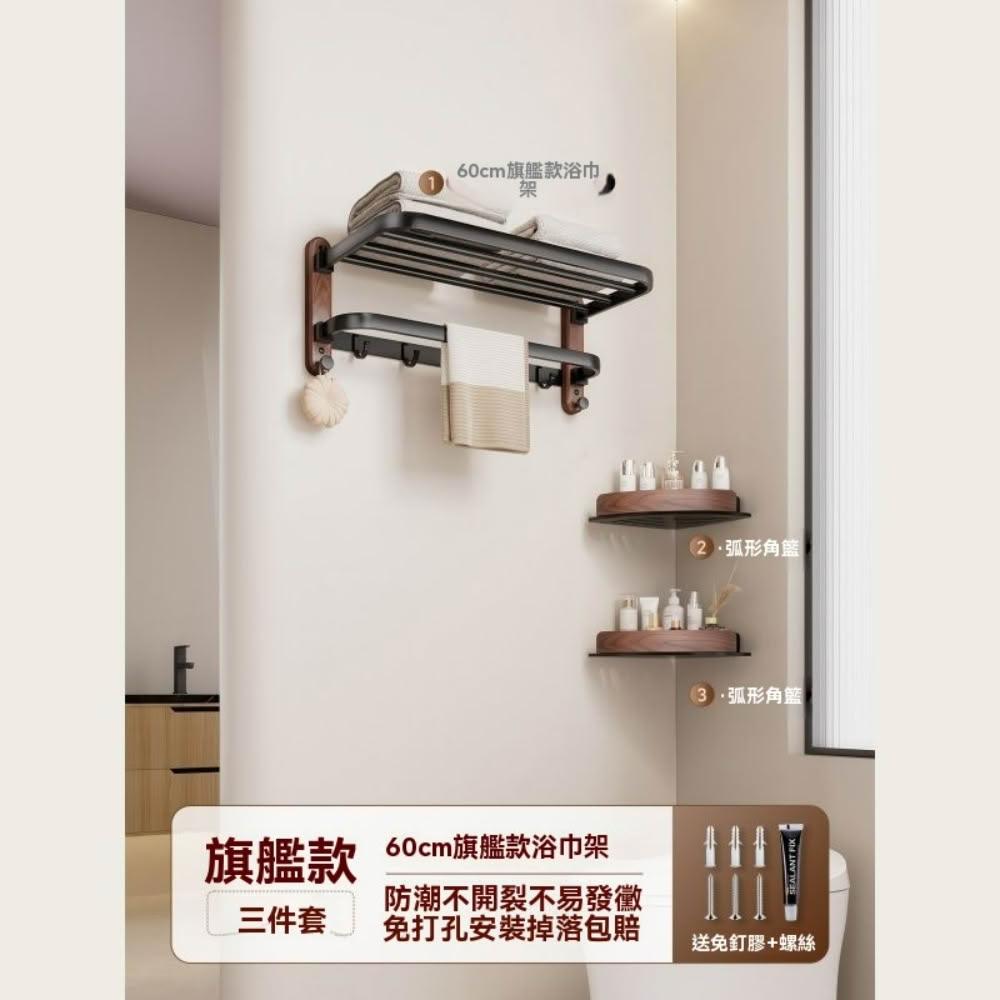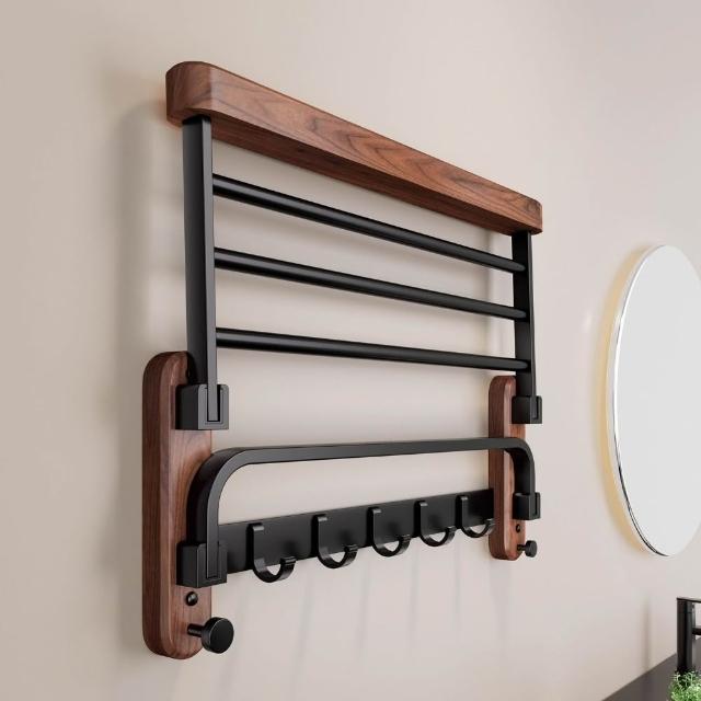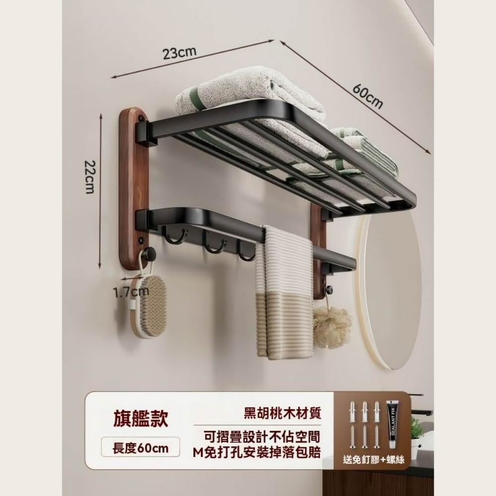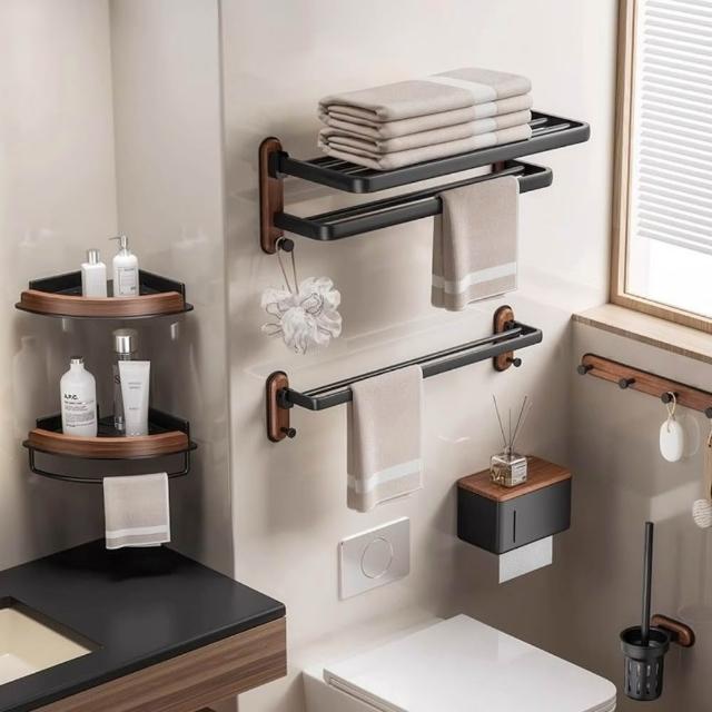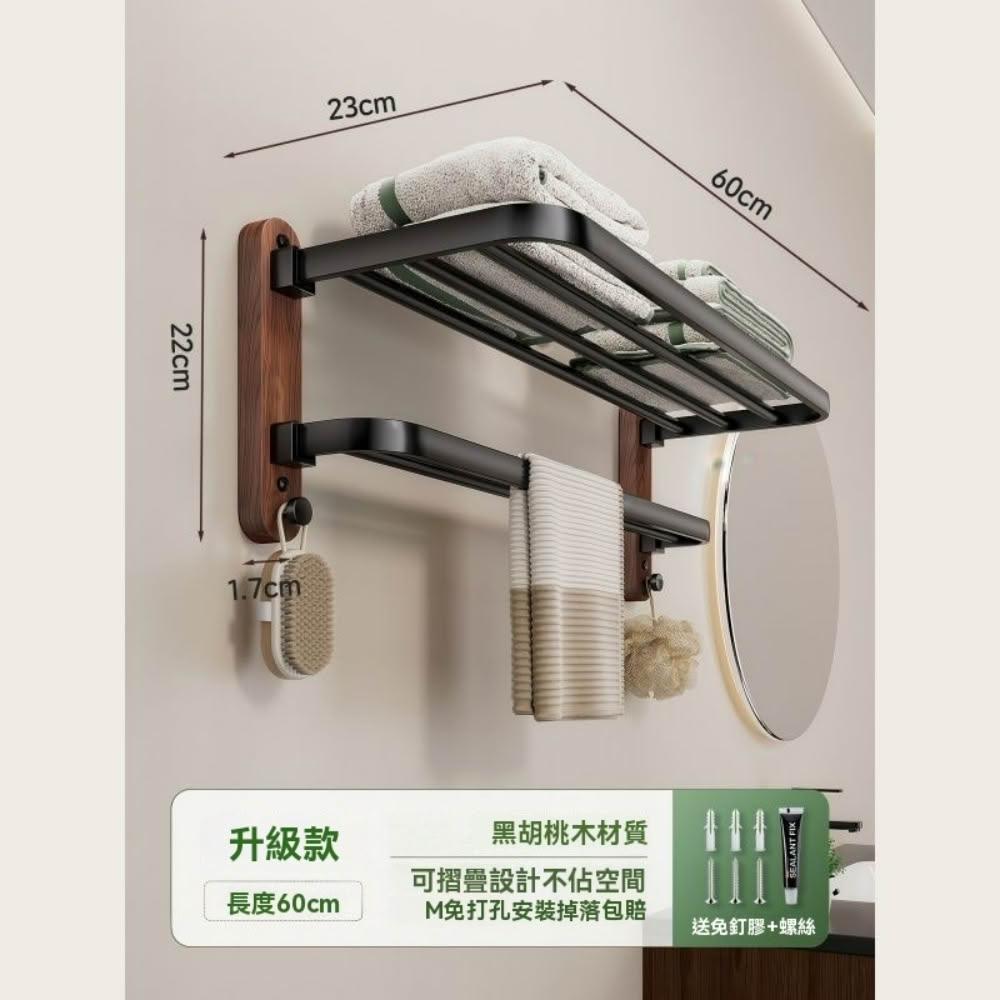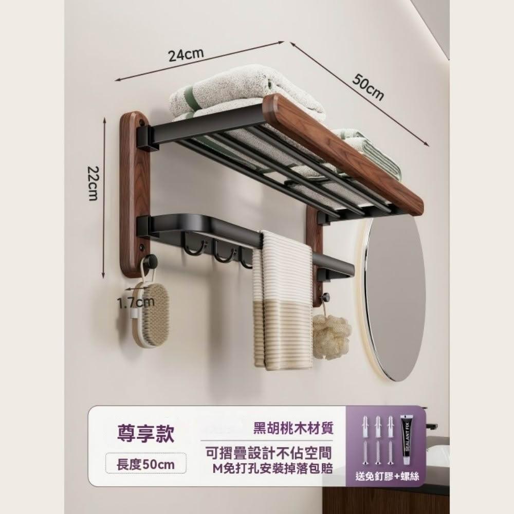 胡桃木毛巾架 衛生間免打孔浴室置物架 廁所掛架 毛巾掛桿高端浴巾架 浴室置物架 奶油風毛巾架