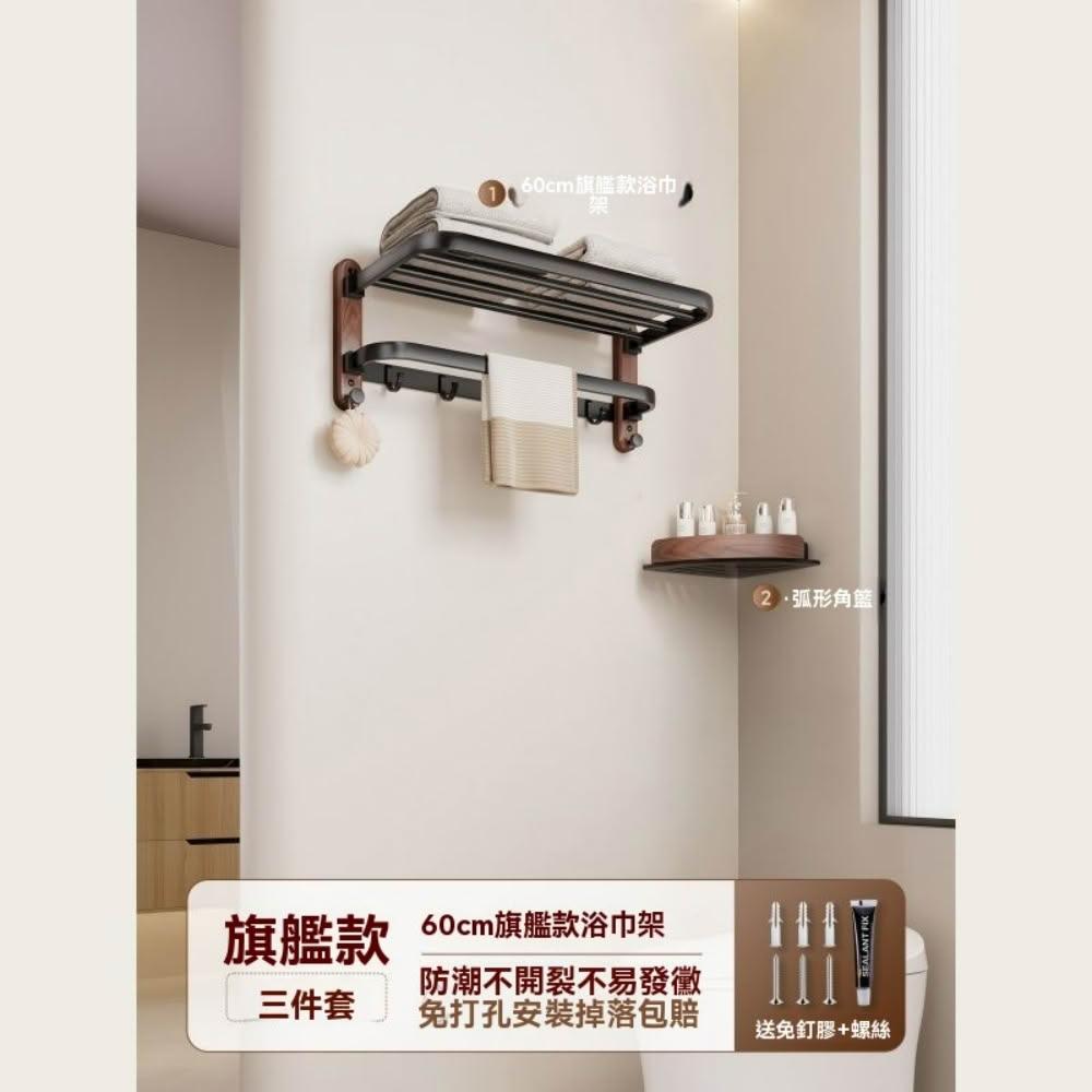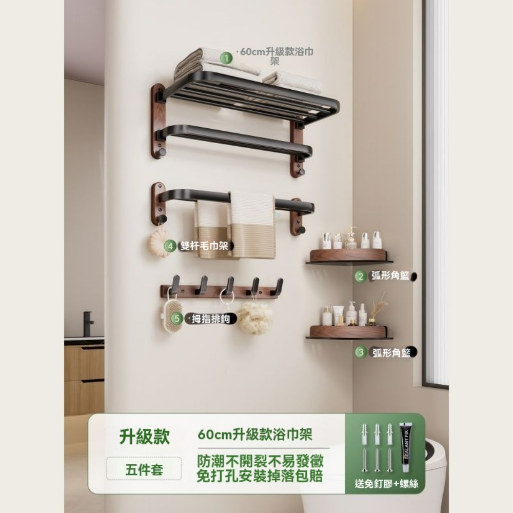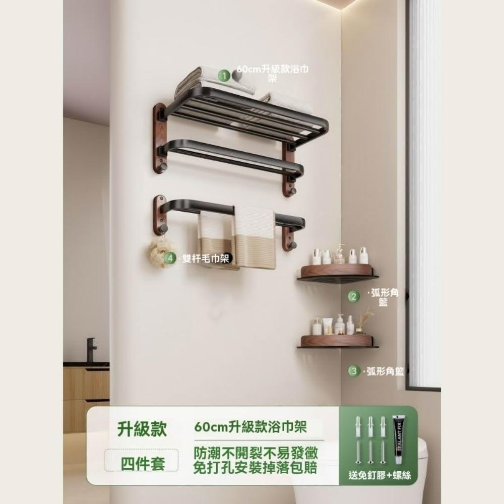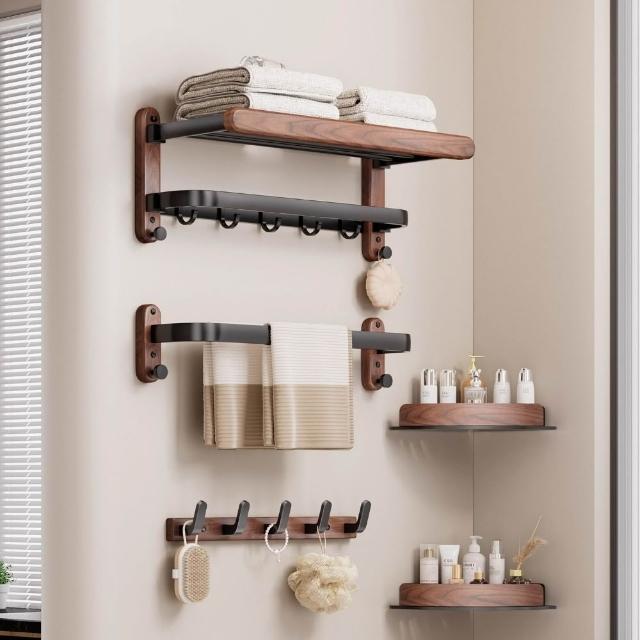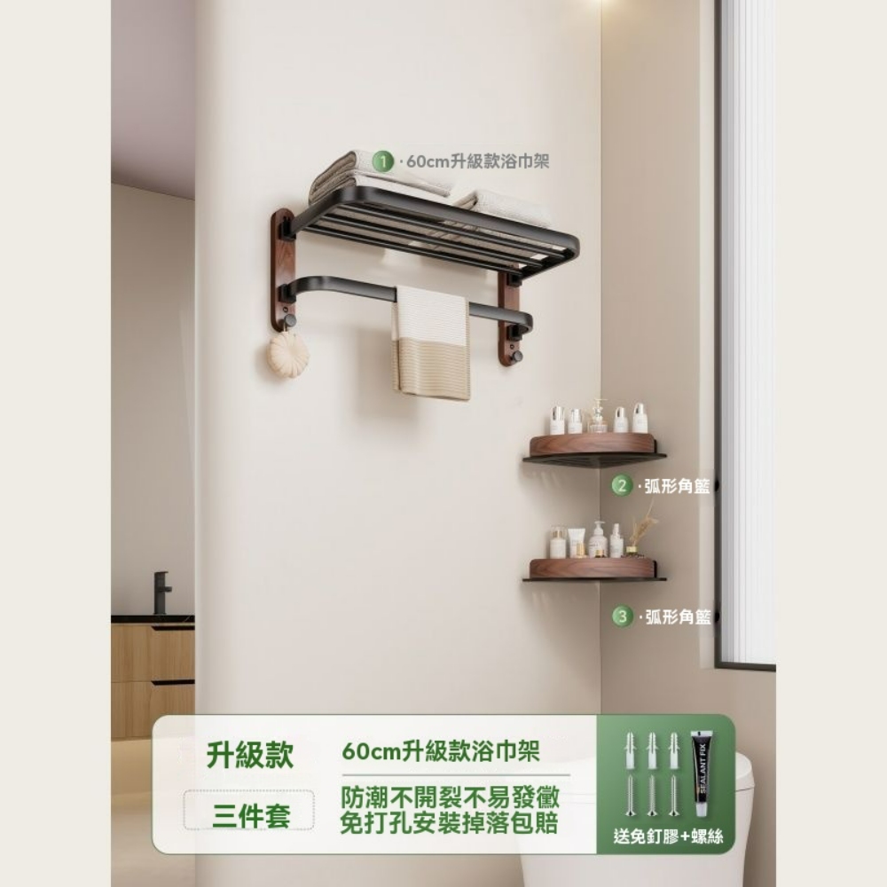 胡桃木毛巾架 衛生間免打孔浴室置物架 廁所掛架 毛巾掛桿高端浴巾架 浴室置物架 奶油風毛巾架
