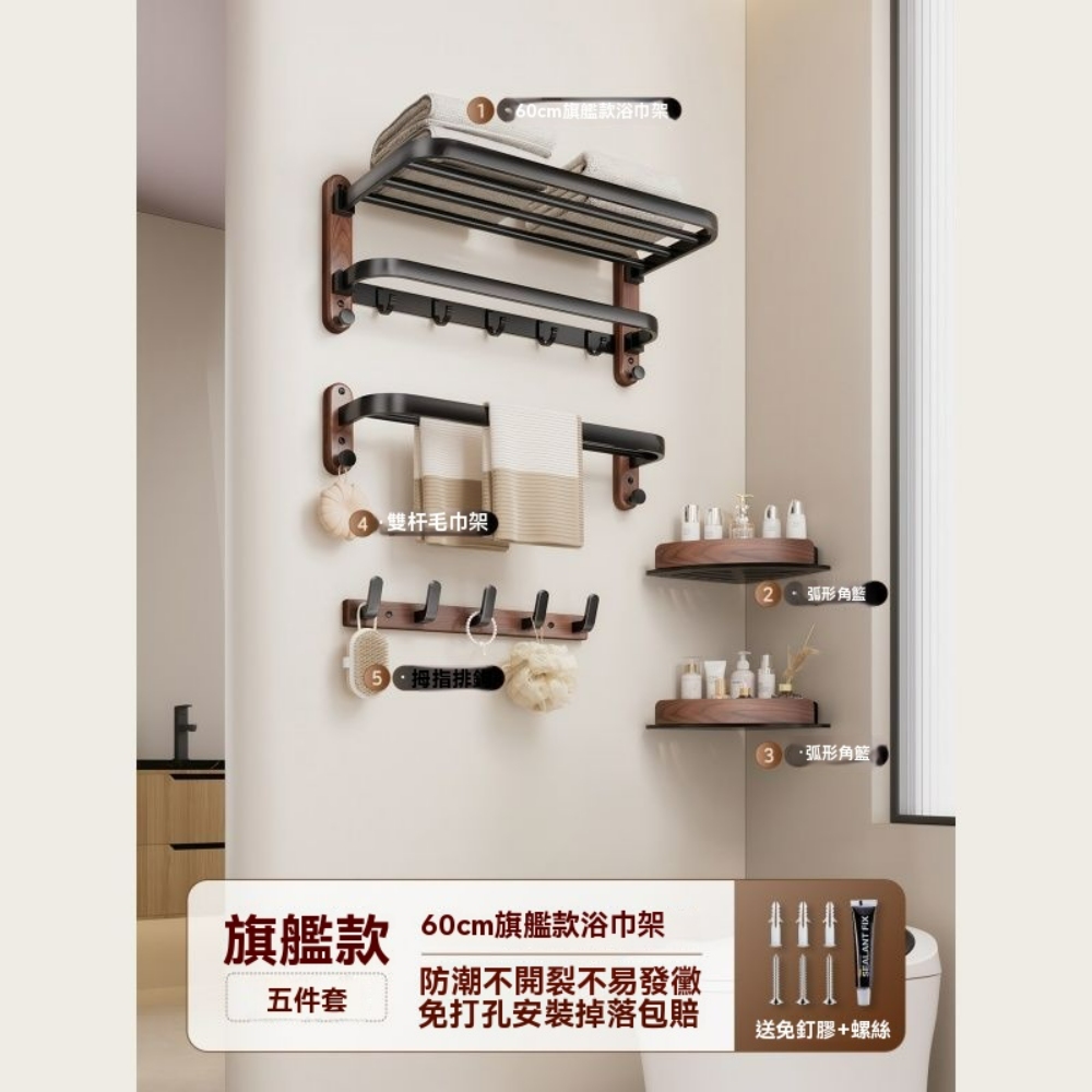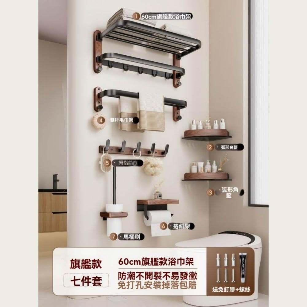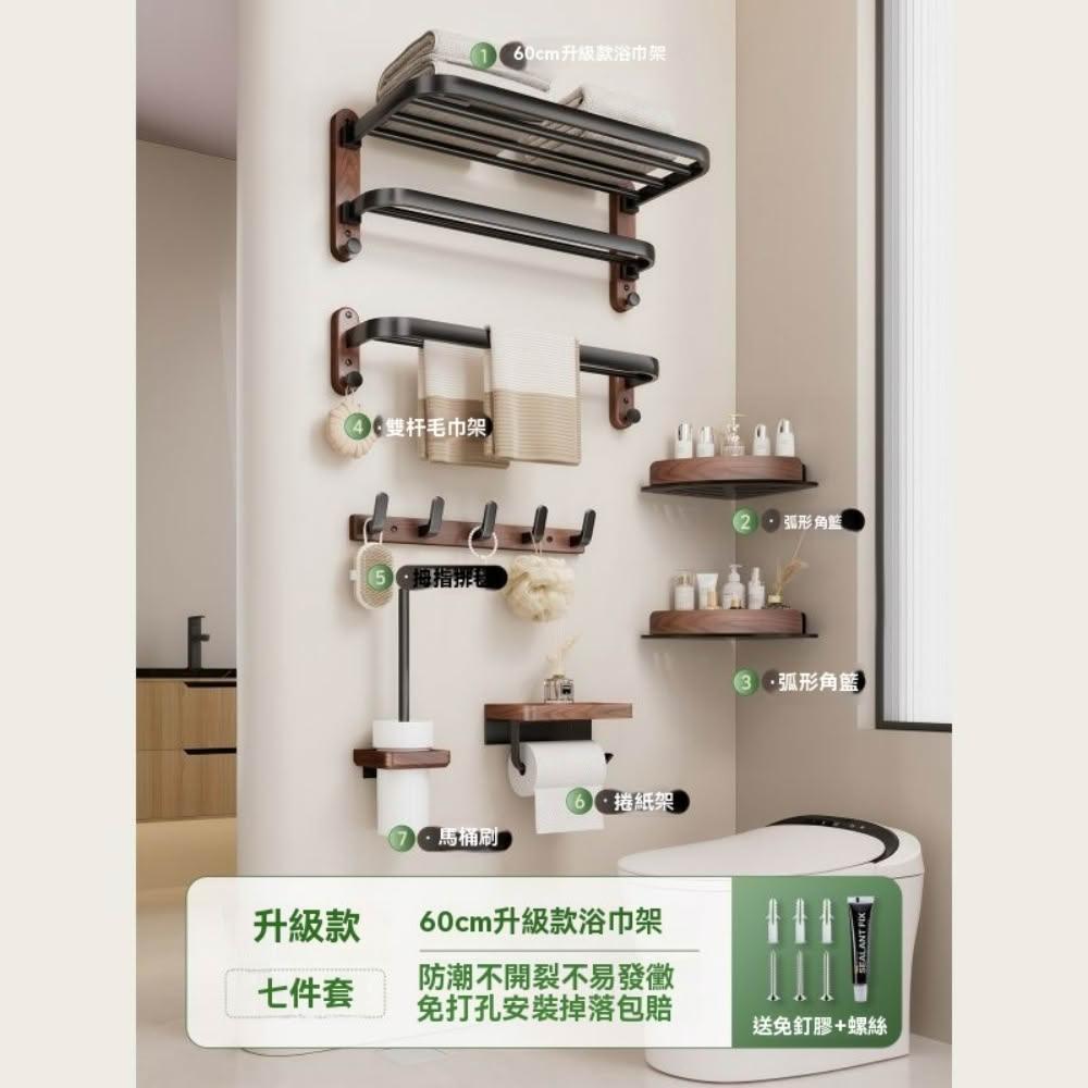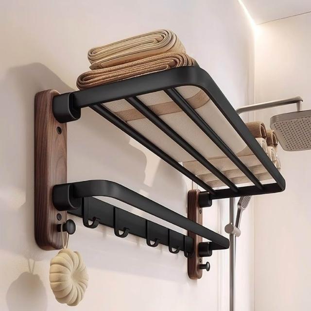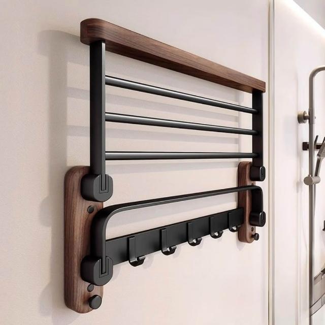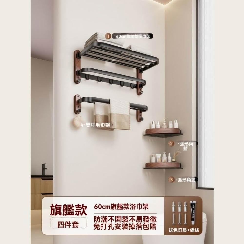 胡桃木毛巾架 衛生間免打孔浴室置物架 廁所掛架 毛巾掛桿高端浴巾架 浴室置物架 奶油風毛巾架