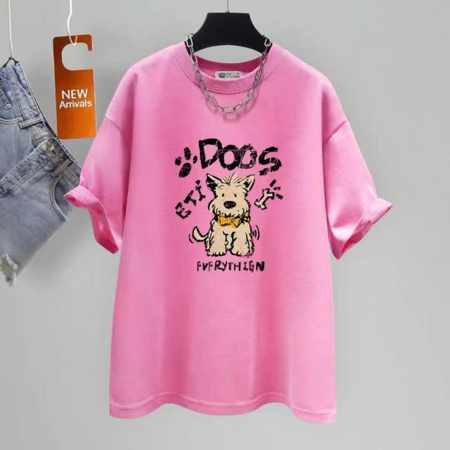 100%純棉短袖 酒紅色T恤 可愛小狗 夏天衣服 時尚女裝 大碼女裝 大版中長款 卡通印花 寬鬆顯瘦 小眾設計感上衣
