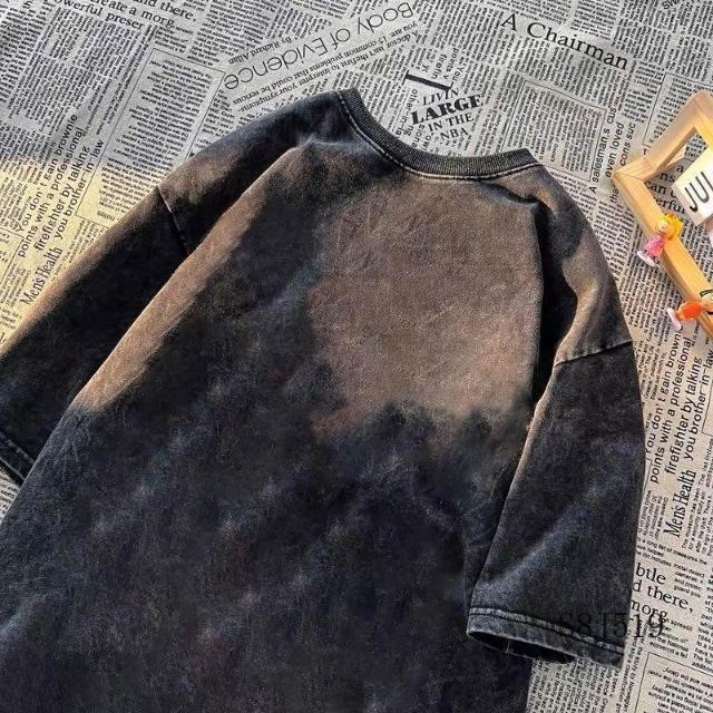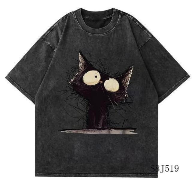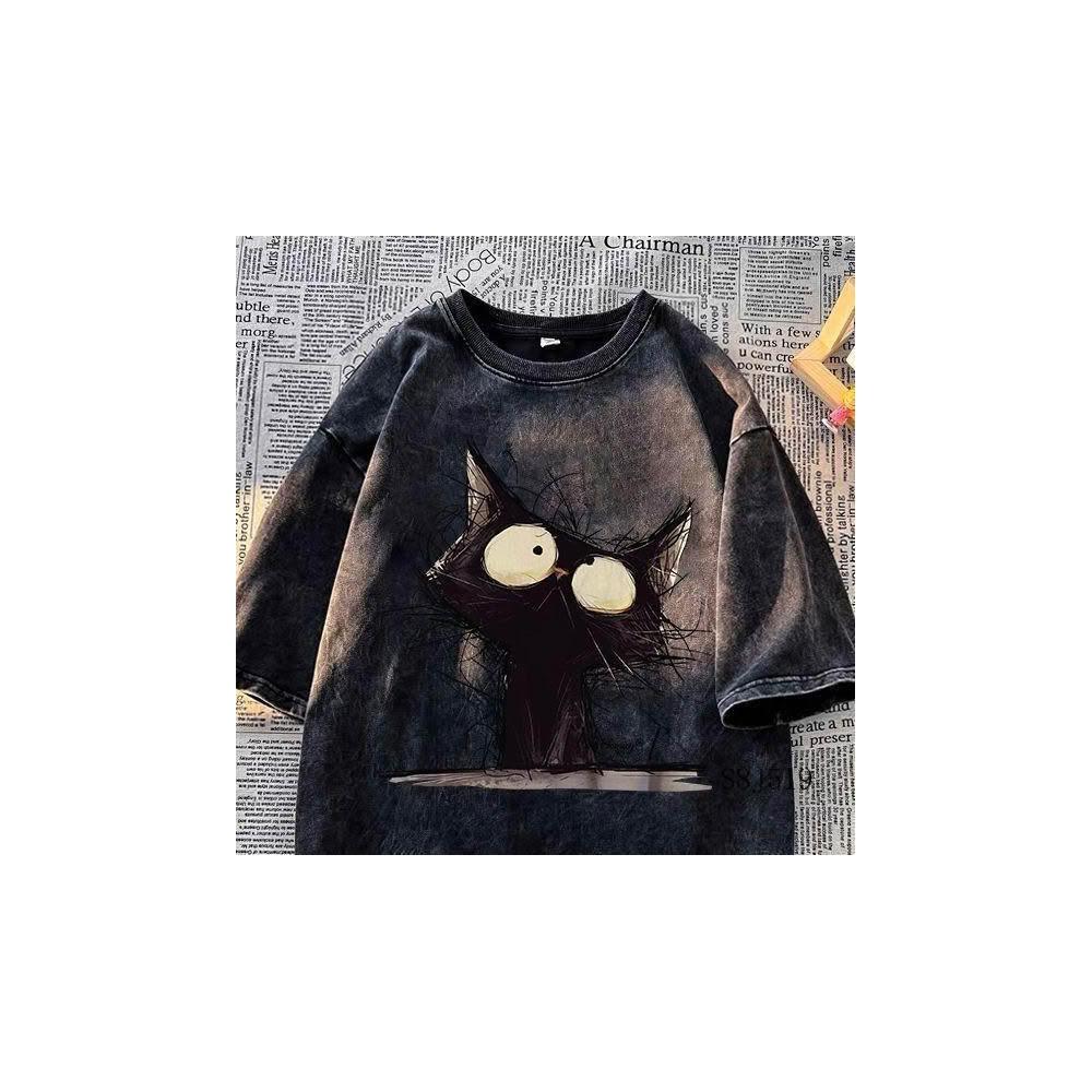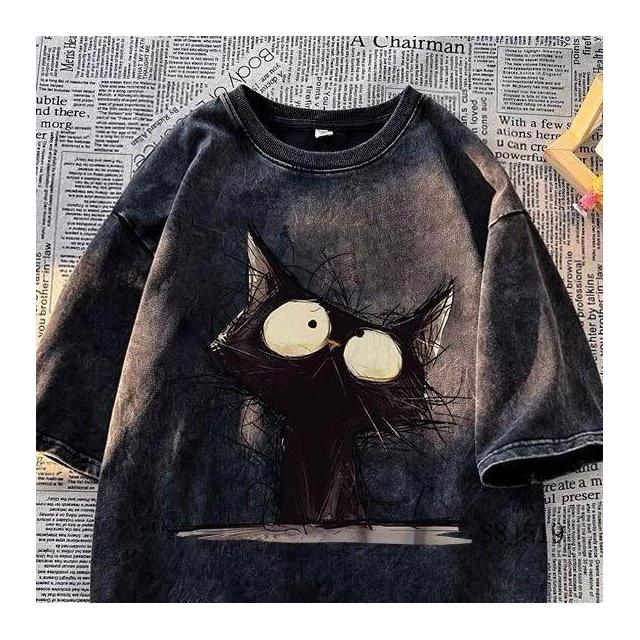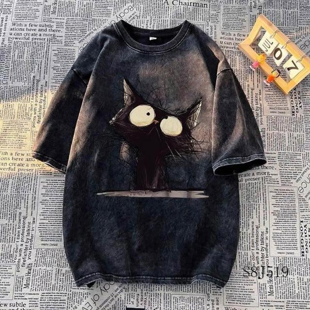 清倉撿漏暗黑貓咪印花短袖t恤男女夏做舊水洗黑潮ins百搭情侶上衣