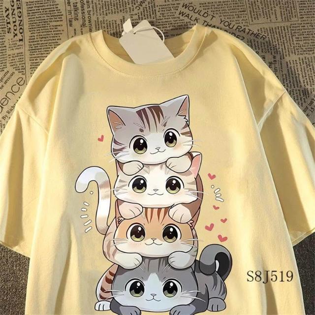 美式復古潮牌貓咪印花短袖t恤男女ins潮半袖寬鬆oversize高街上衣