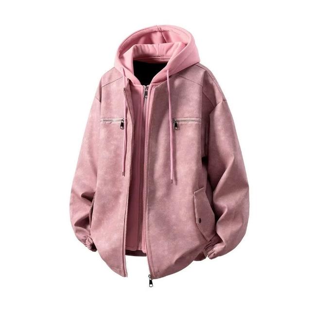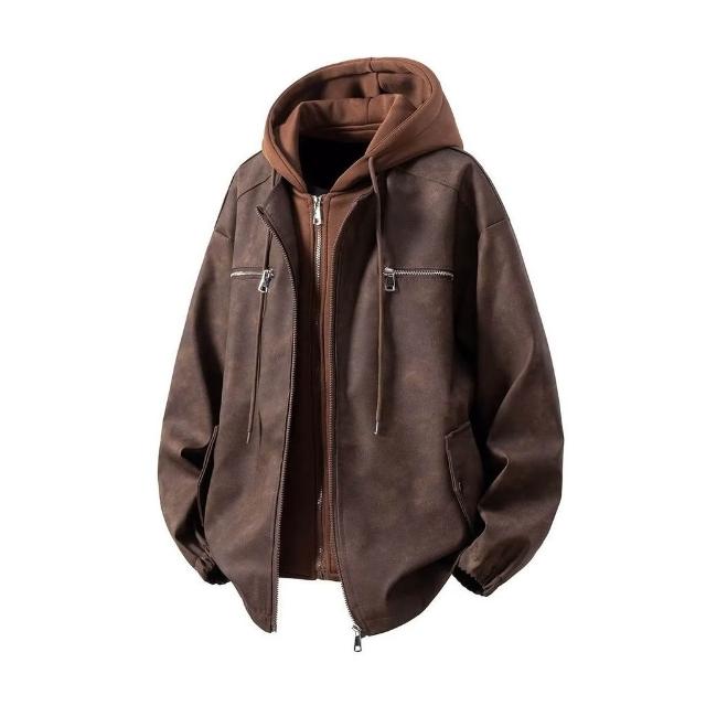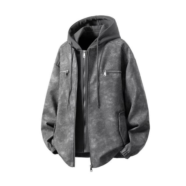 熱賣爆款 2025假兩件衛衣帽PU皮新款夾克男秋冬季潮寬鬆設計感痞帥外套