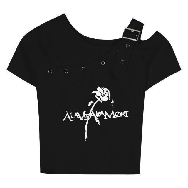 露肩鎖骨短袖t恤女夏短款上衣花朵印花不規則露肩短袖t恤夏季
