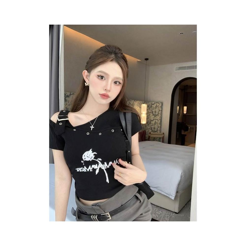 露肩鎖骨短袖t恤女夏短款上衣花朵印花不規則露肩短袖t恤夏季