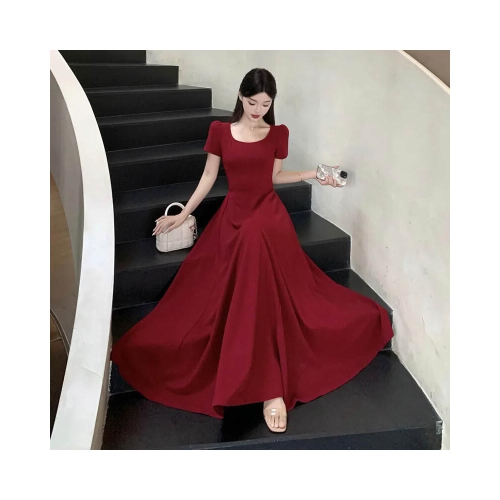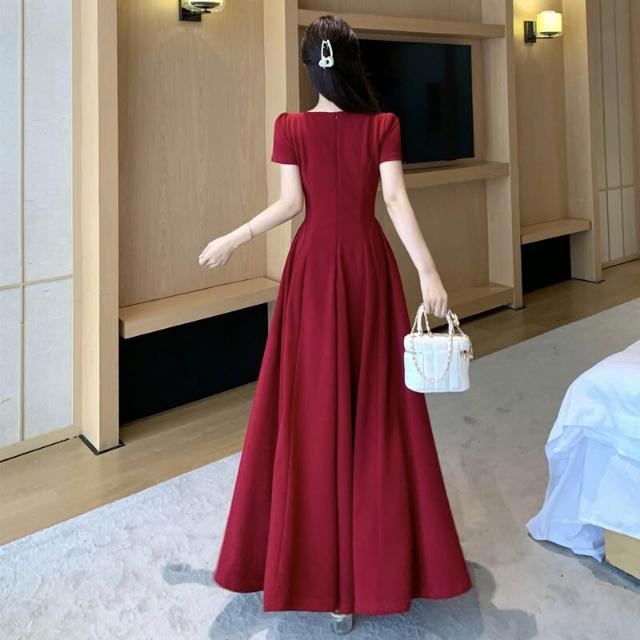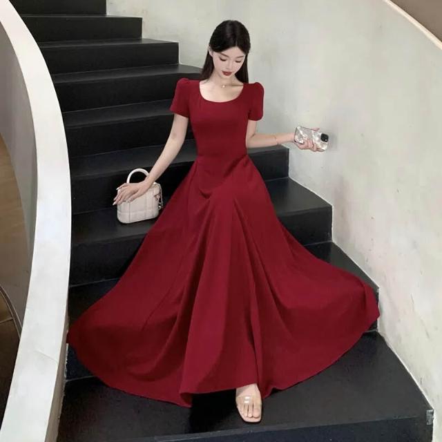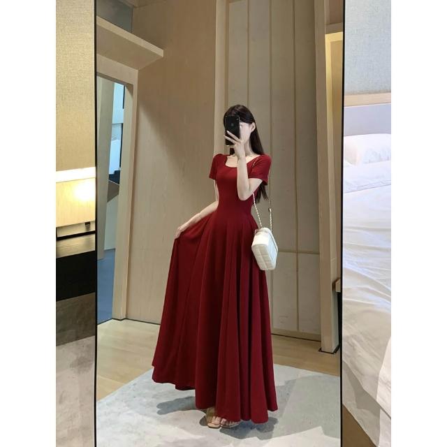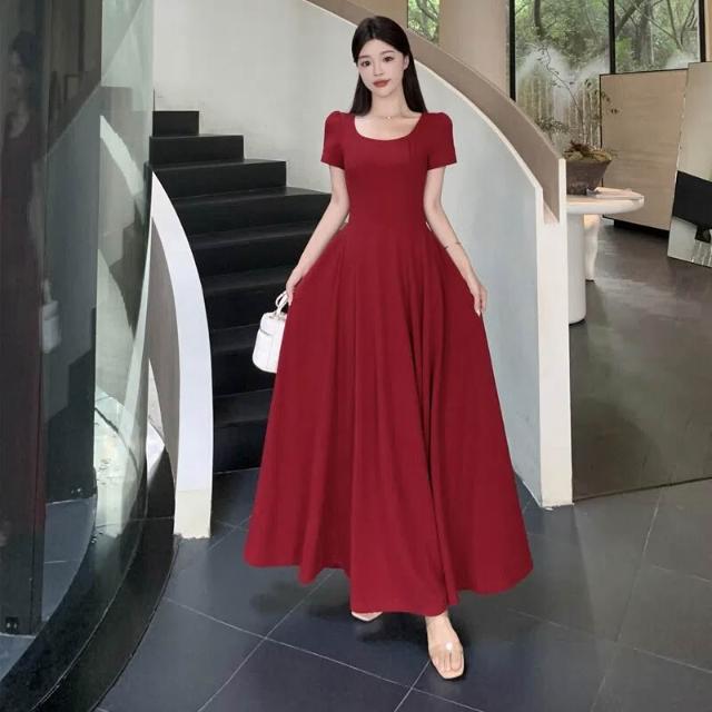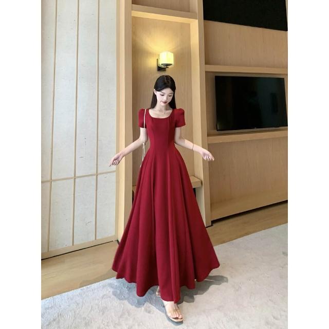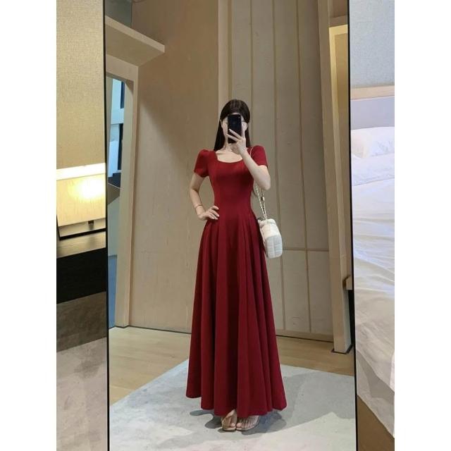 M-4XL 法式紅色方領短袖洋裝 A字裙 收腰連身裙 大擺裙 禮服洋裝 紅色洋裝 大尺碼洋裝 夏天洋裝 法式洋裝