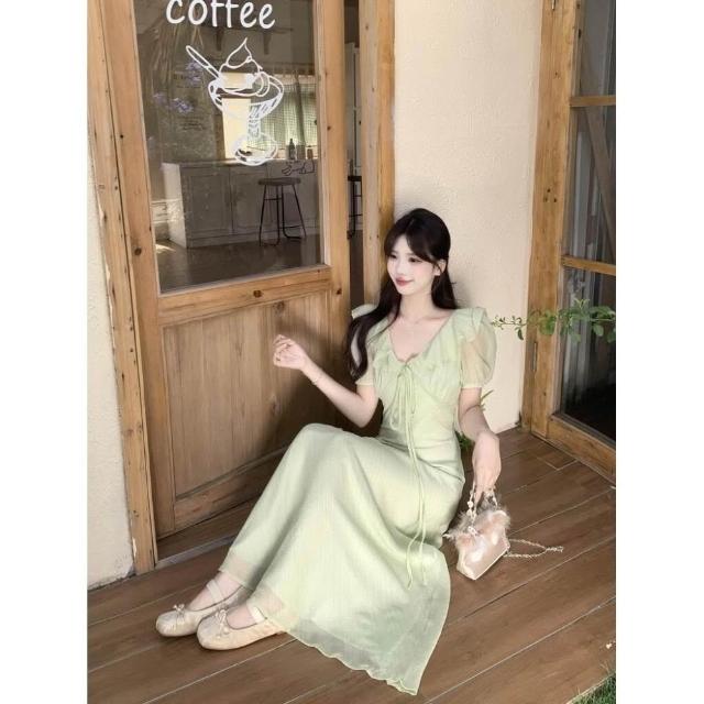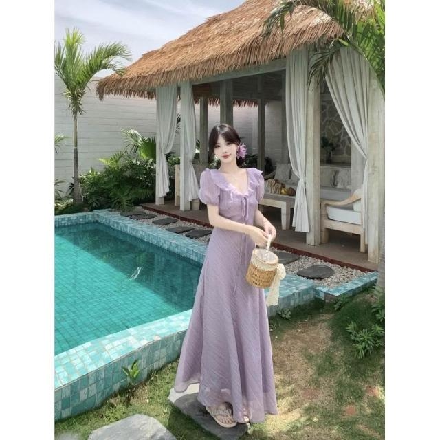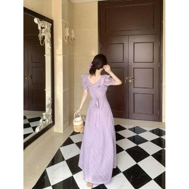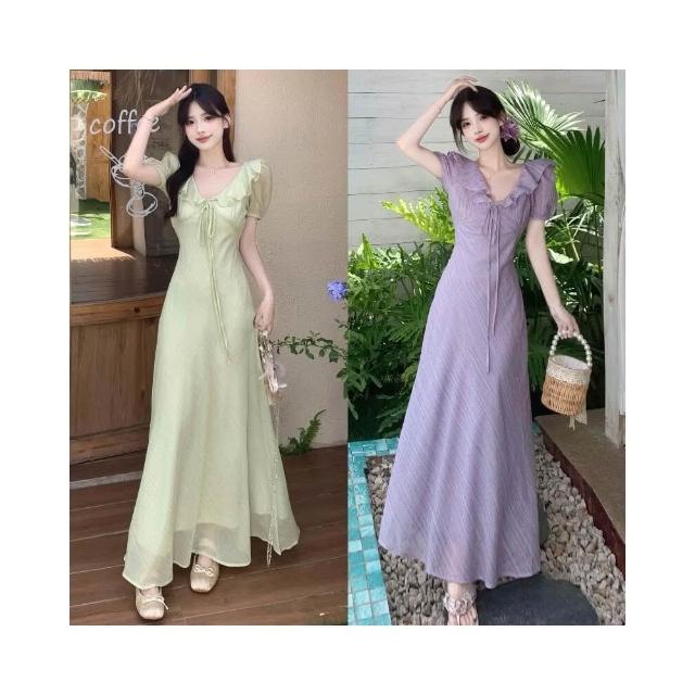 M-4XL 法式溫柔風荷葉邊V領泡泡袖連身裙 收腰顯瘦連身裙 肌理感長裙 大碼女裝 大尺碼洋裝 顯瘦洋裝 紫色女裝