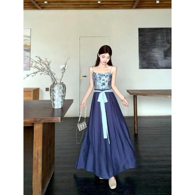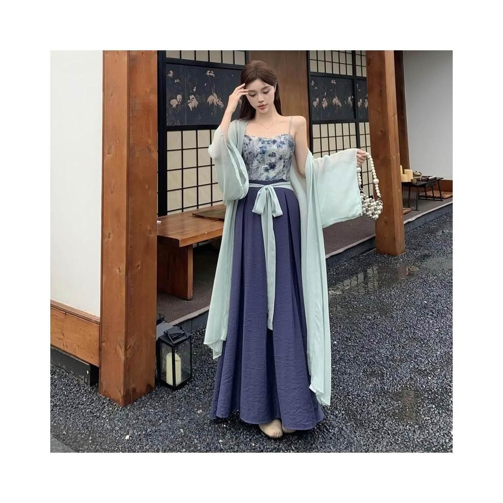 M-4XL 江南煙雨 新中式國風禪意古風吊帶裙+改良漢元素雪紡開衫兩件套 新中式穿搭 大尺碼女裝 古風穿搭
