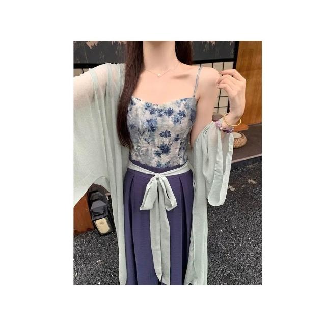 M-4XL 江南煙雨 新中式國風禪意古風吊帶裙+改良漢元素雪紡開衫兩件套 新中式穿搭 大尺碼女裝 古風穿搭