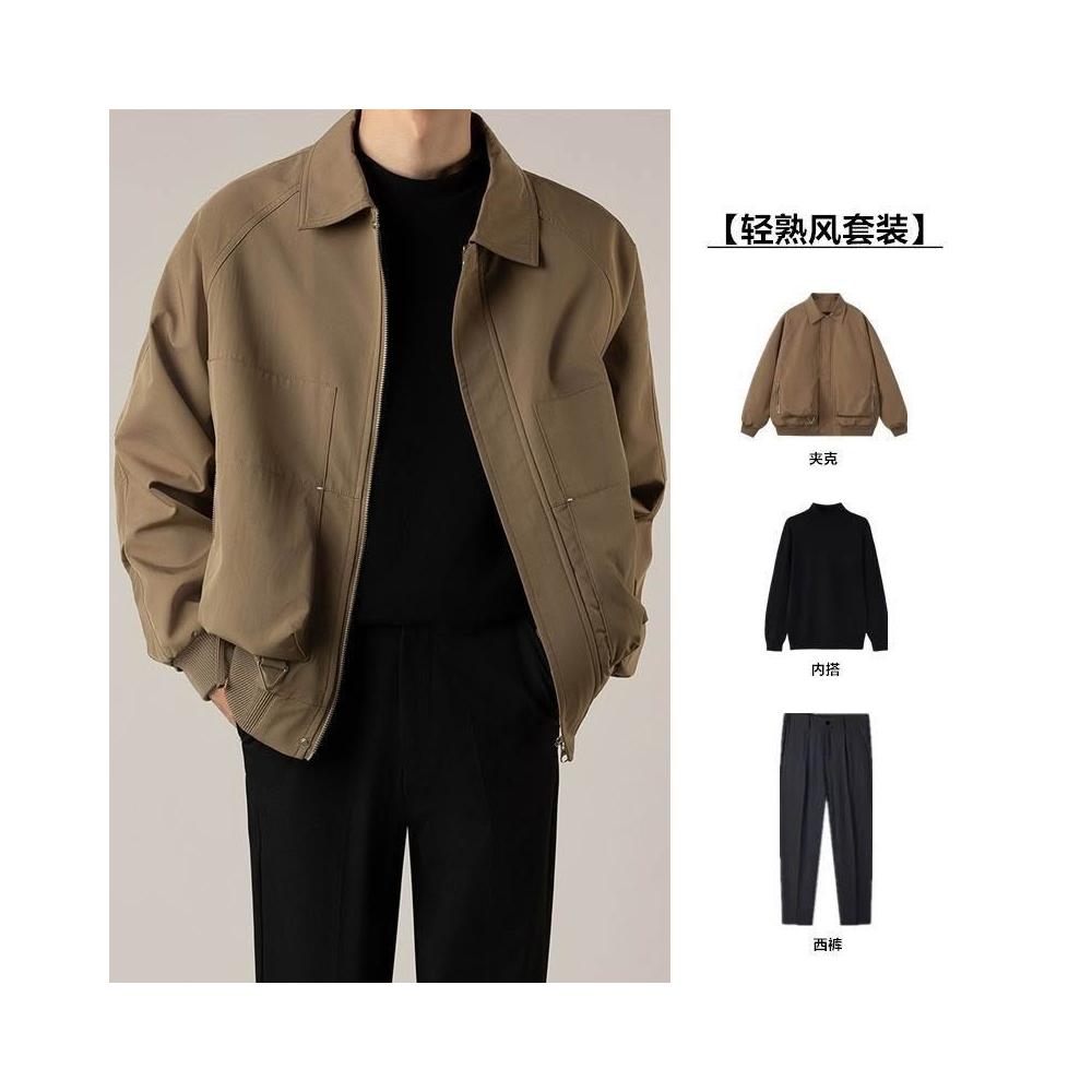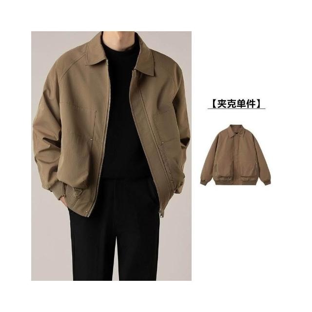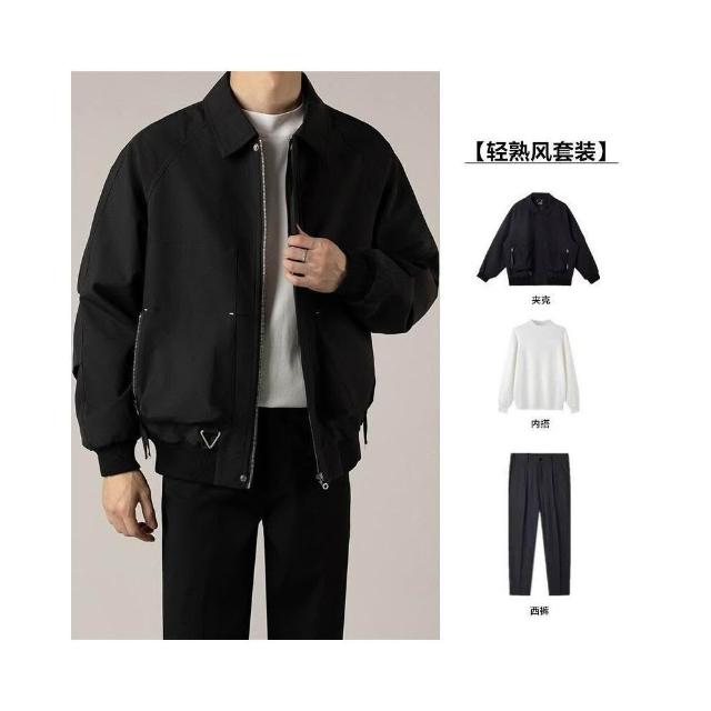 【 韓版輕熟風男裝三件套寬鬆短款翻領夾克男士高級感夾克休閒上衣潮