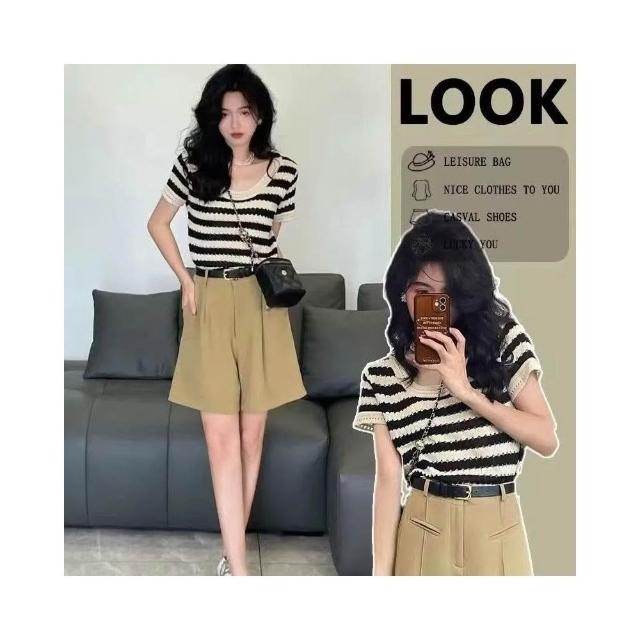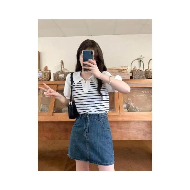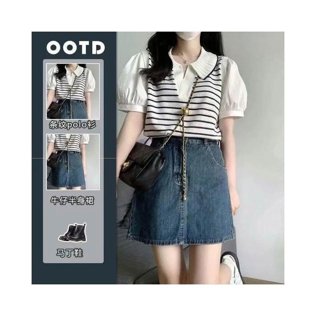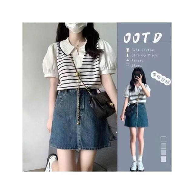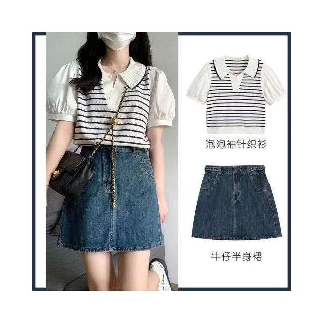 少女甜辣套裝 禦姐風兩件套 單件 小個子穿搭 高腰顯瘦牛仔裙 條紋襯 刺繡襯 女上衣 泡泡袖 短款 時尚搭配 甜美小香風