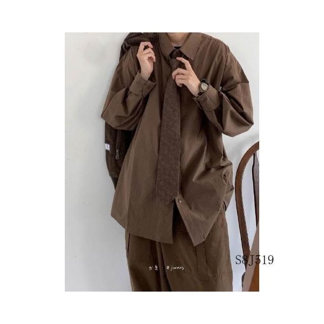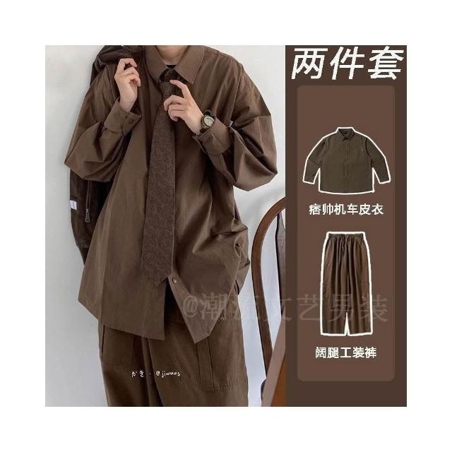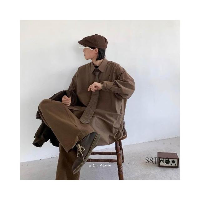 日系復古高級墜感長袖襯衫男春秋季棕色寬鬆內搭襯衣休閒工裝套裝