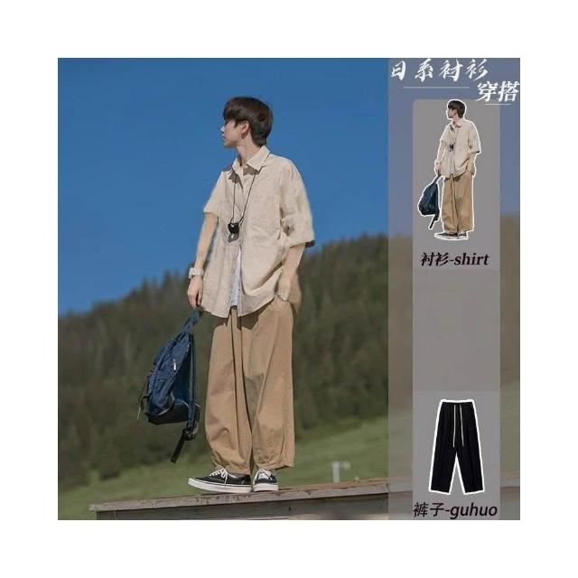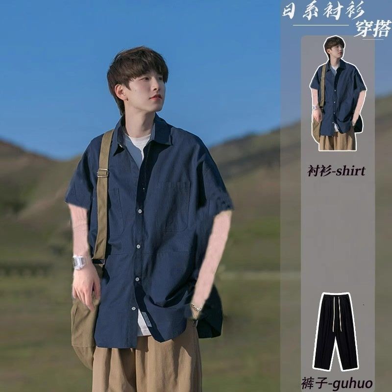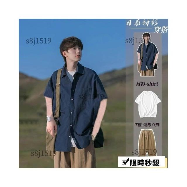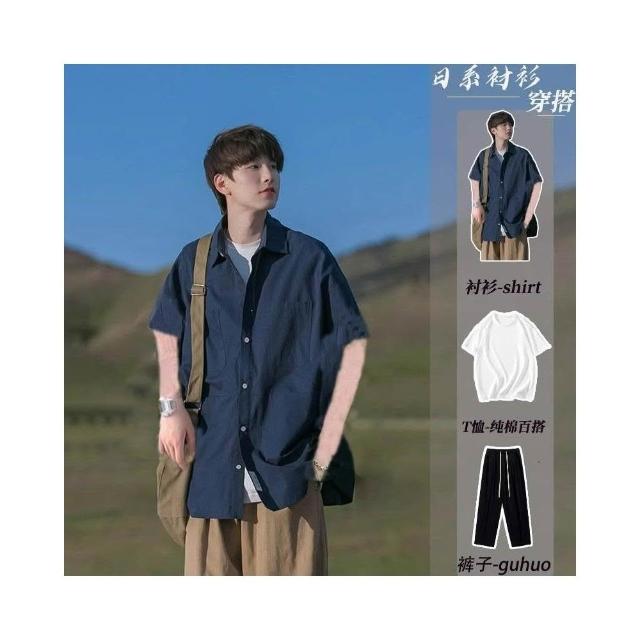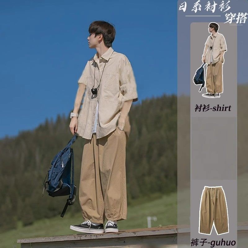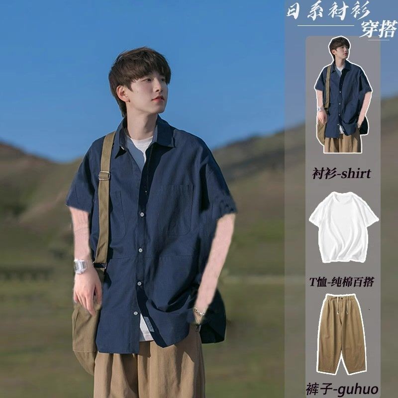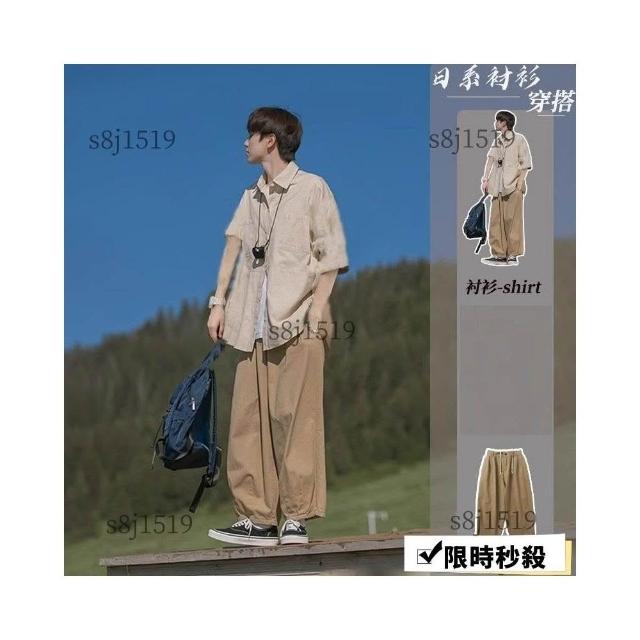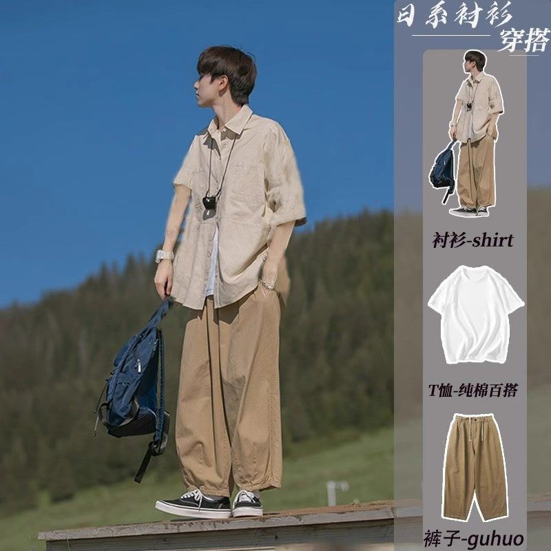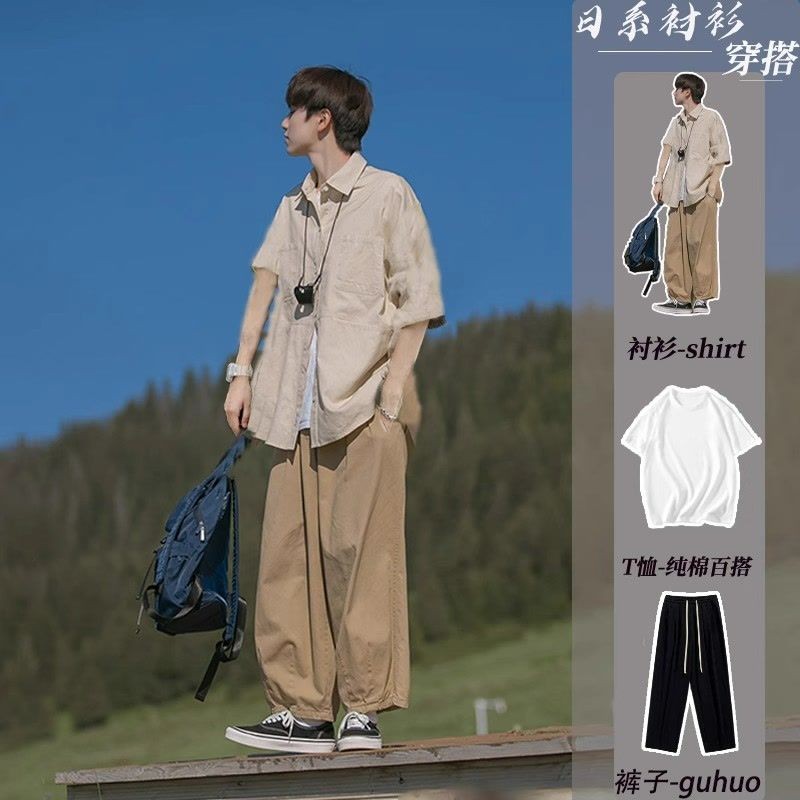 台灣免運男生衣著 休閒套裝 夏季新款 短袖工裝襯衫男夏季套裝穿搭帥氣日係休閒男裝一套男生衣服三件套1037