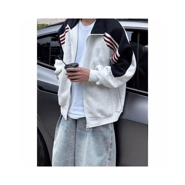 台灣免運撞色2025三條開衫拼接衛衣男女立領復古寬鬆情侶條紋夾克外套899