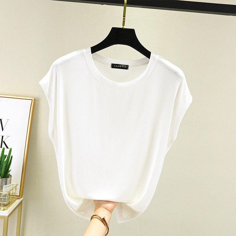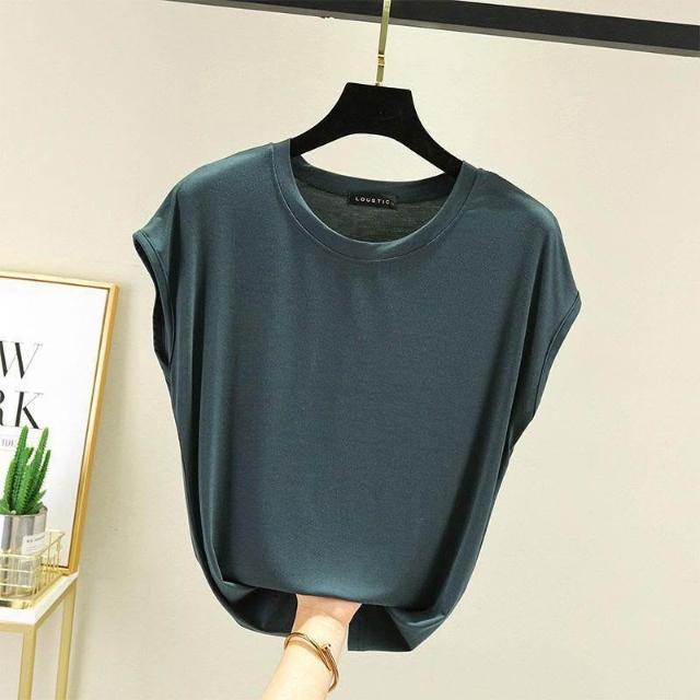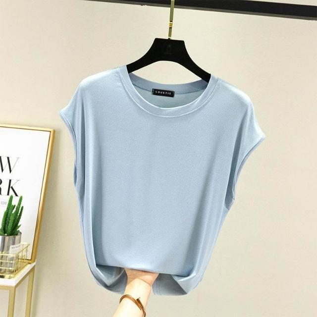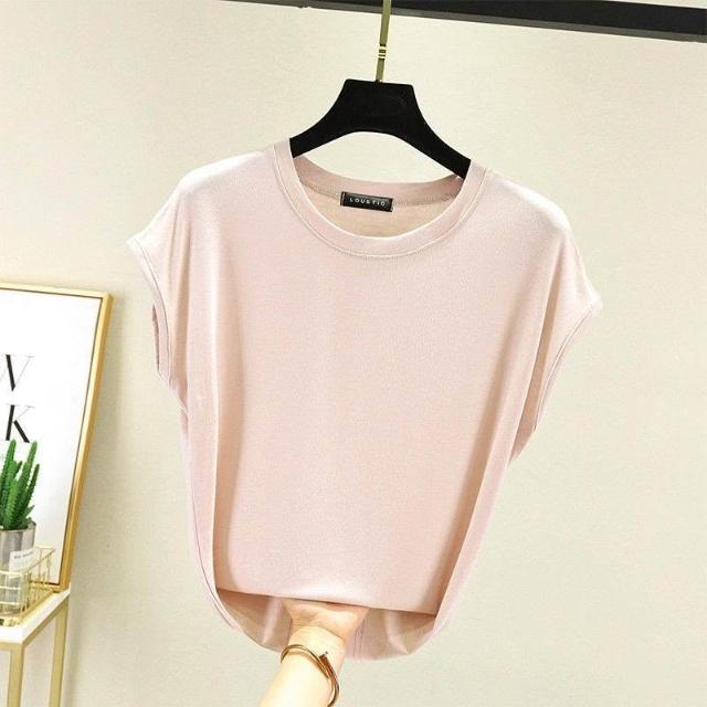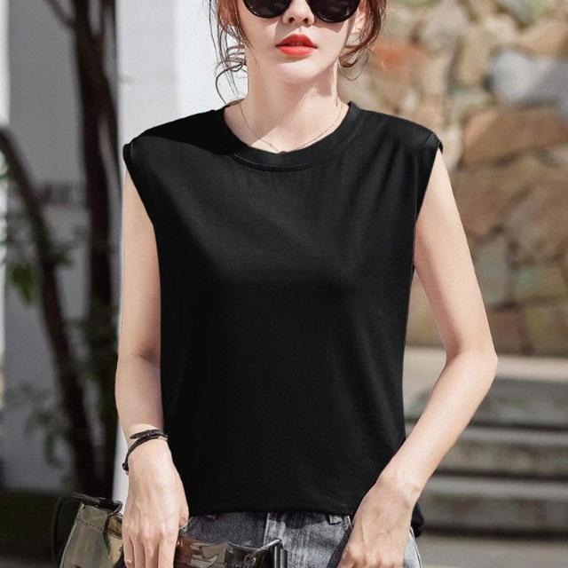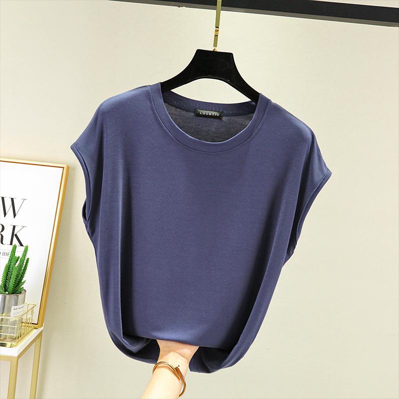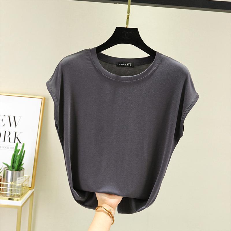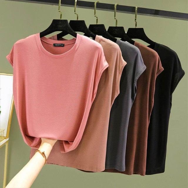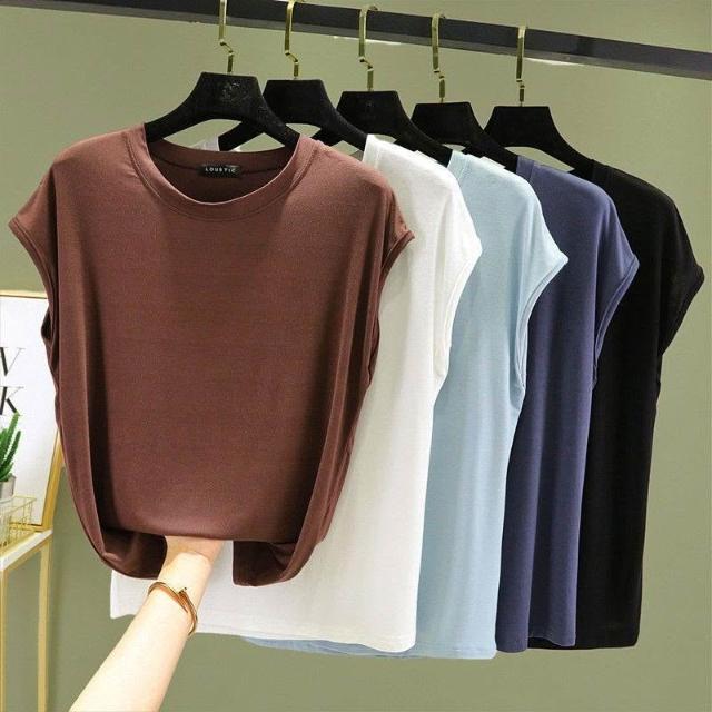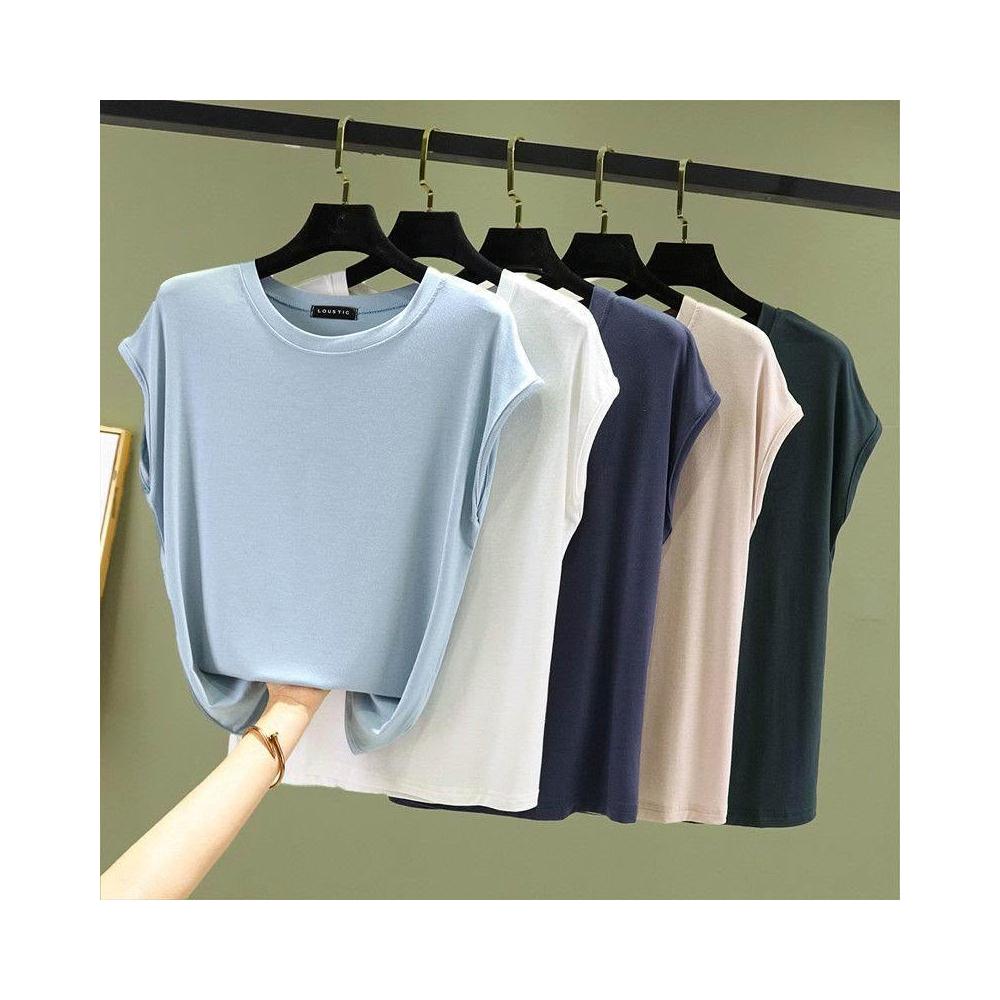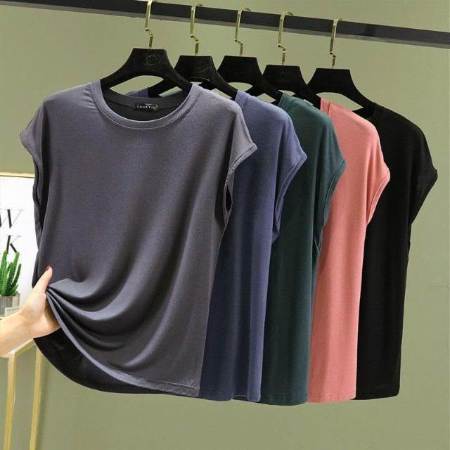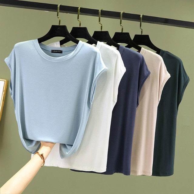 莫代爾無袖T恤女夏2024年新短袖打底圓領寬鬆大碼純色顯瘦上衣女