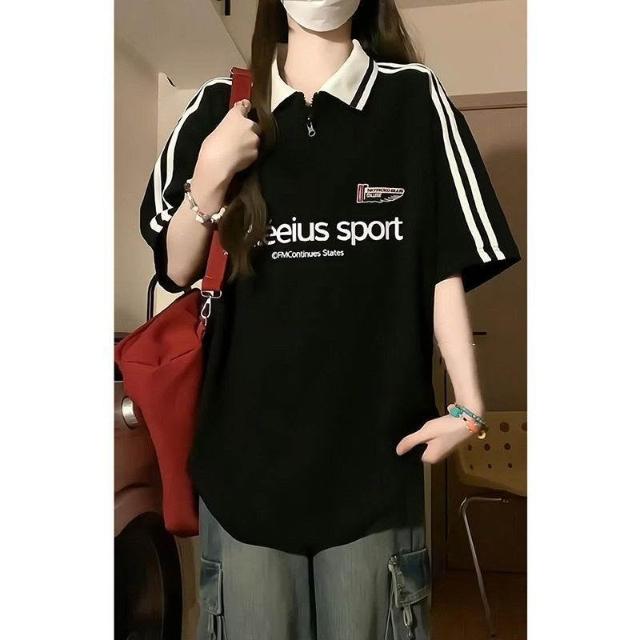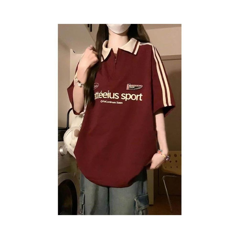 美式復古酒紅色polo衫正肩短袖t恤男女夏季寬鬆學院風半拉鍊上衣