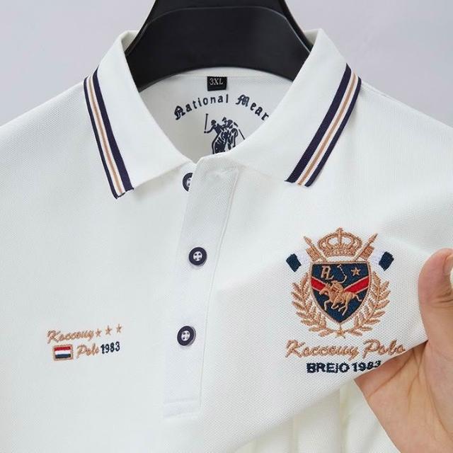 夏季外貿新款刺繡100重磅寬松珠地POLO衫翻領紫色t恤男士短袖t恤