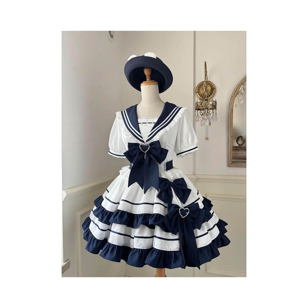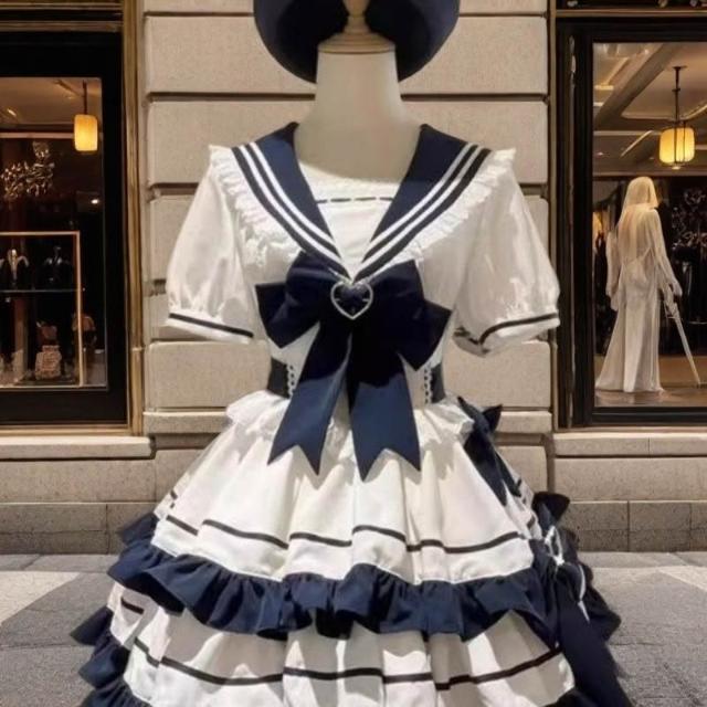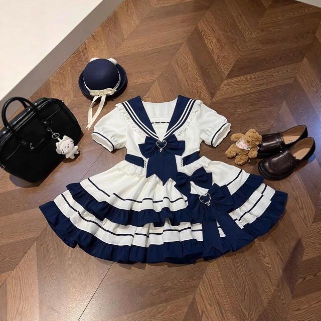 台湾热销 甜美溫柔少女感Lolita裙洛麗塔海軍學院風撞色拼接收腰蓬蓬連衣裙