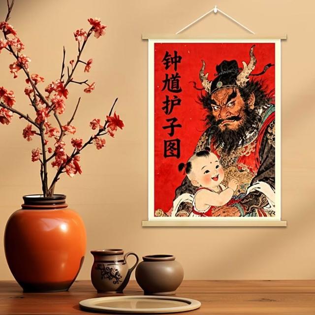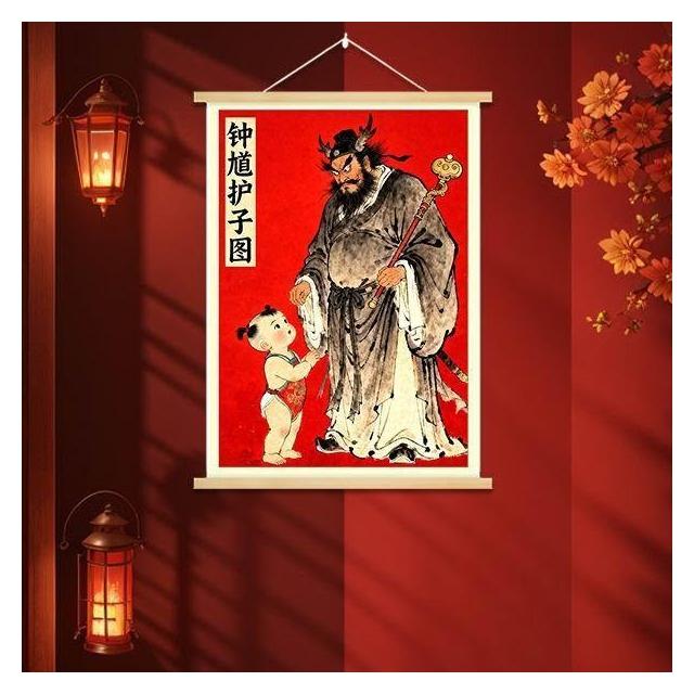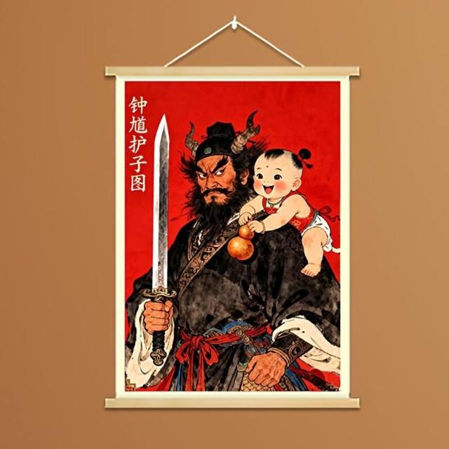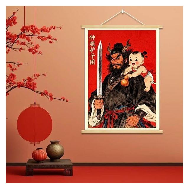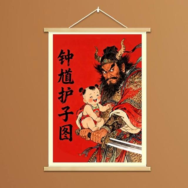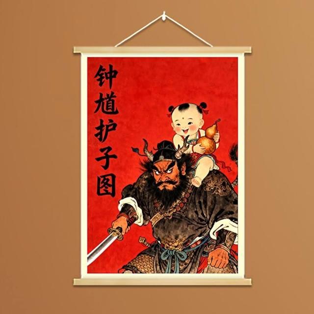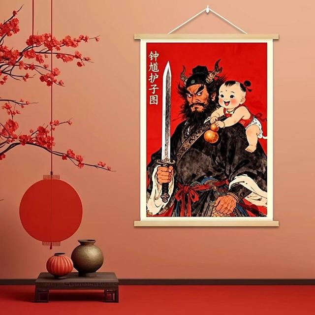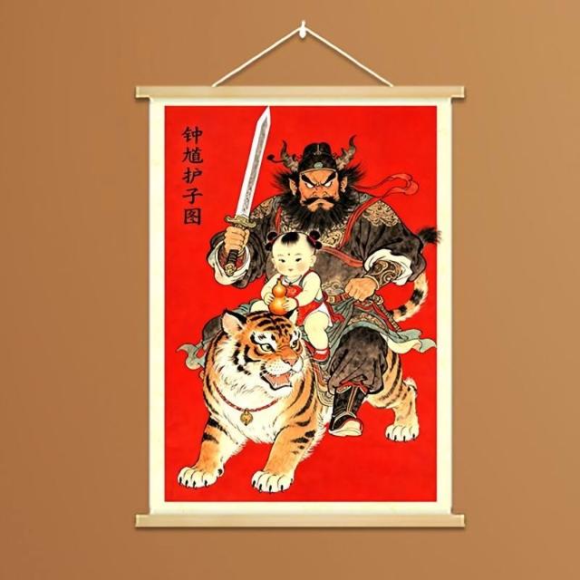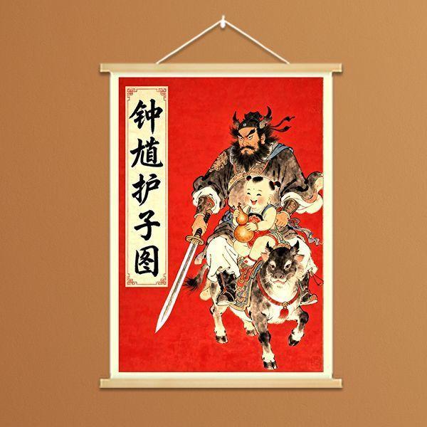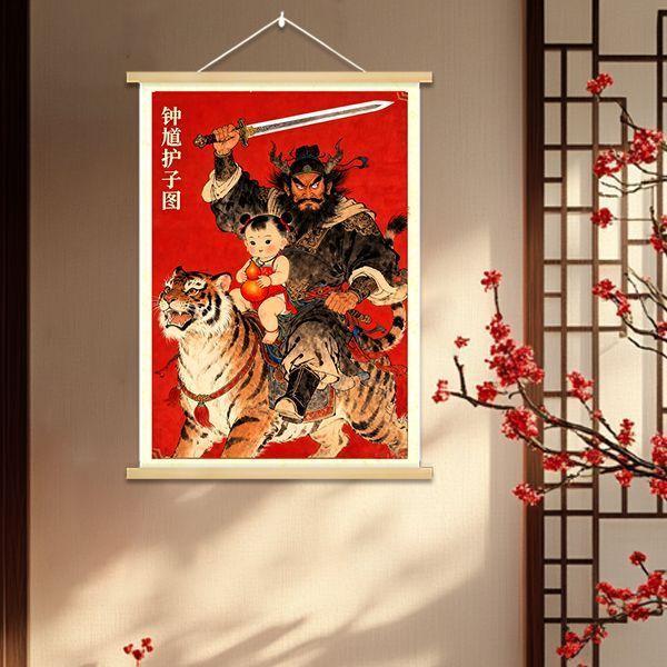 中式國風鍾馗護子圖實木掛畫新年裝飾掛件保護女孩平安臥室裝飾畫