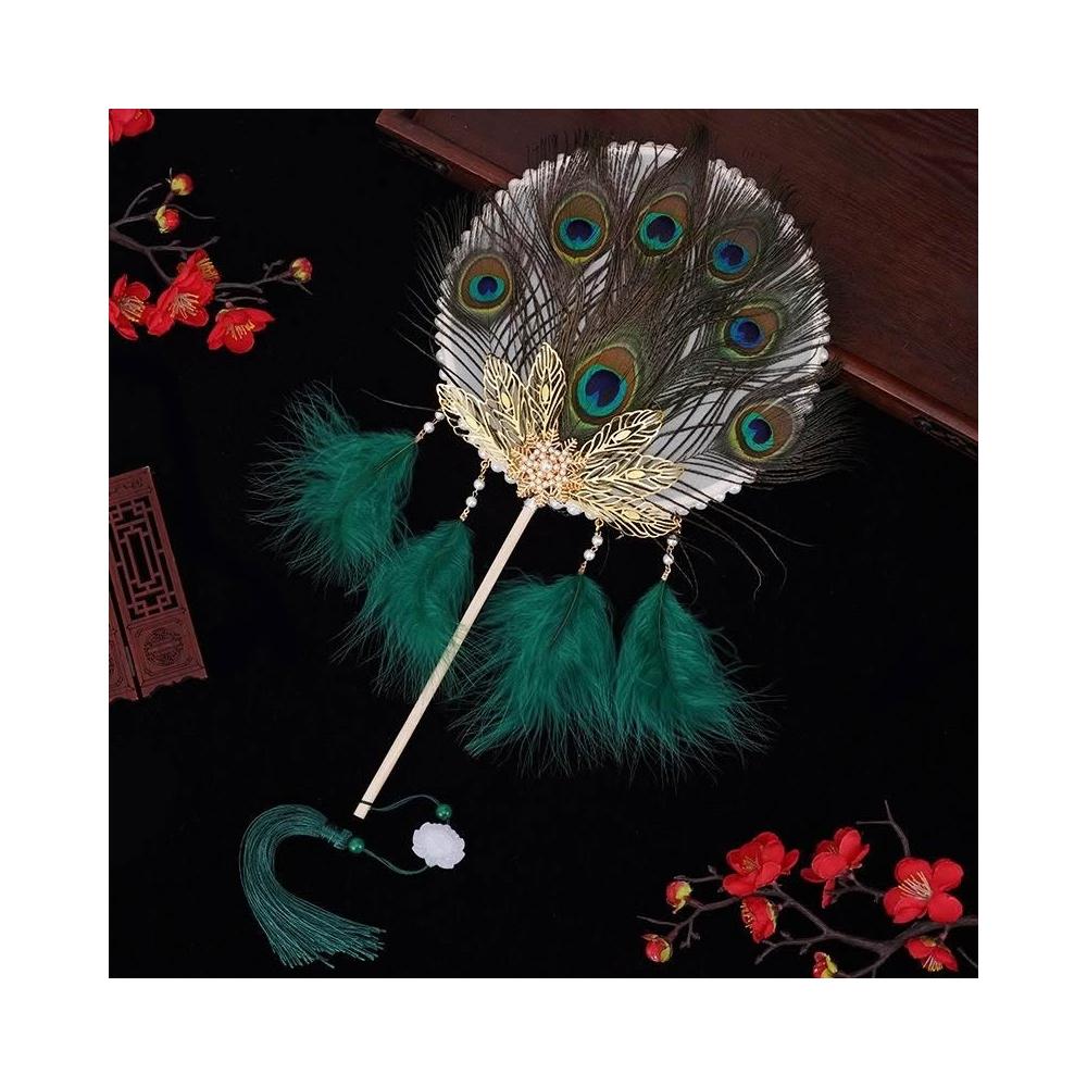 孔雀羽毛絨團扇子古風長柄漢服旗袍配飾手持扇表演出拍攝道具扇