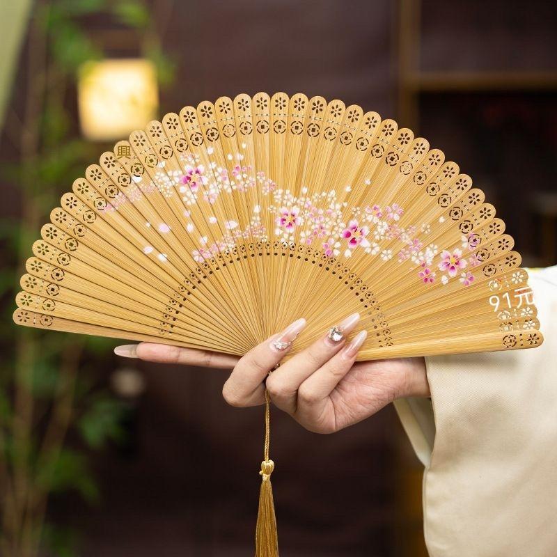 古風全竹扇子雕刻鏤空古風男女士摺扇手工紅黑色小巧舞
