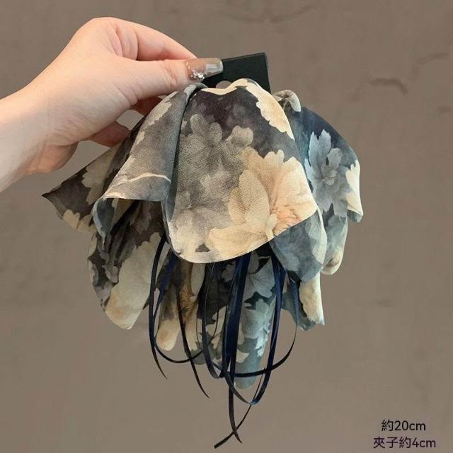 網紅新款森系復古花朵鯊魚夾高級感後腦勺扎低馬尾抓夾飄帶髮夾女