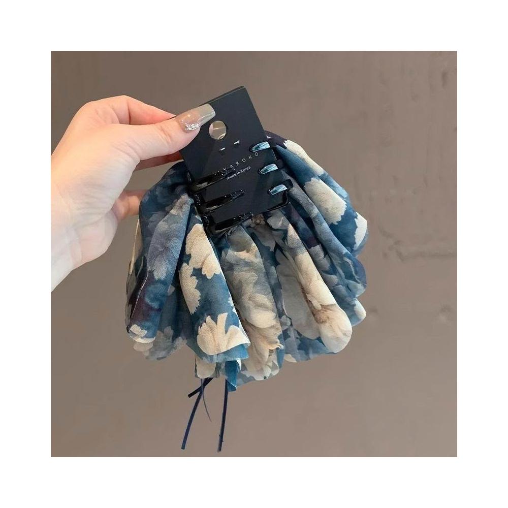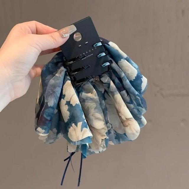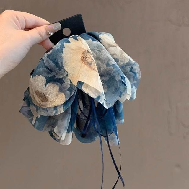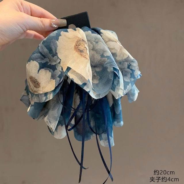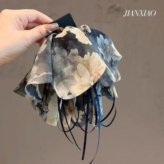 網紅新款森系復古花朵鯊魚夾高級感後腦勺扎低馬尾抓夾飄帶髮夾女