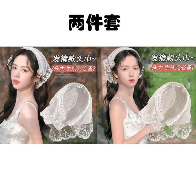 法式蕾絲頭巾女田園風2024新款包頭三角形頭巾海邊束髮帶夏季頭飾