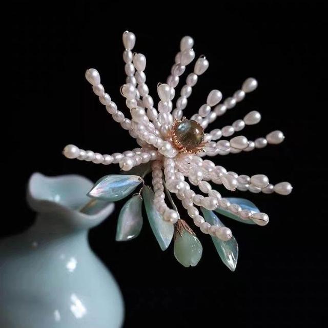 菊花輯珠髮簪成品清雅珍珠手工宮廷復古珠花髮簪手工禮物伴手禮