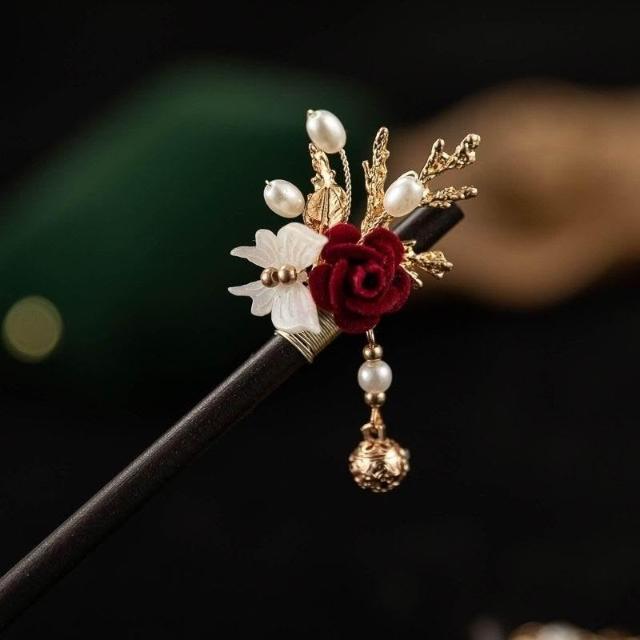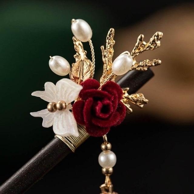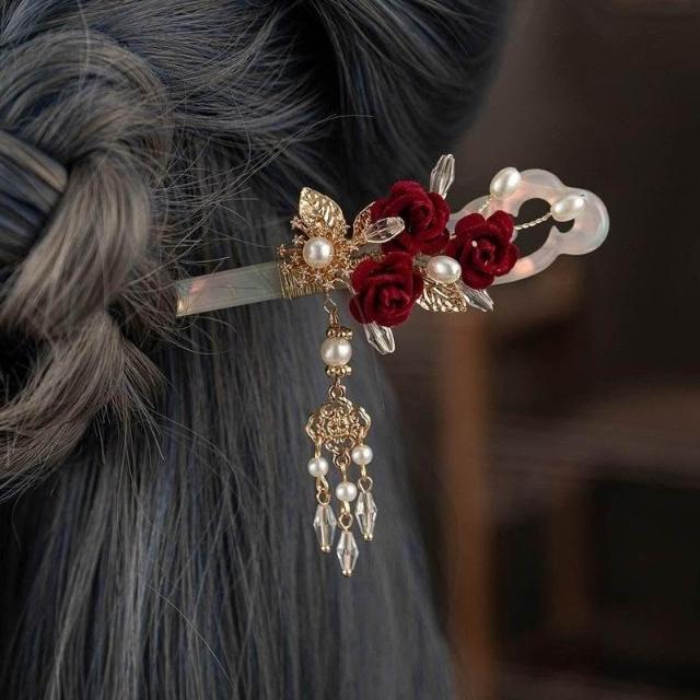 超仙古典氣質小紅玫瑰玉簪古風漢服旗袍髮飾女日常中式挽發頭飾女