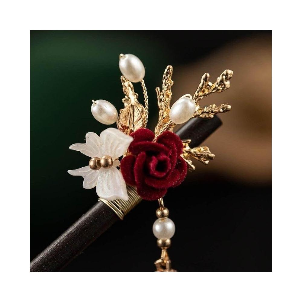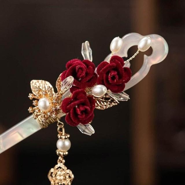 超仙古典氣質小紅玫瑰玉簪古風漢服旗袍髮飾女日常中式挽發頭飾女
