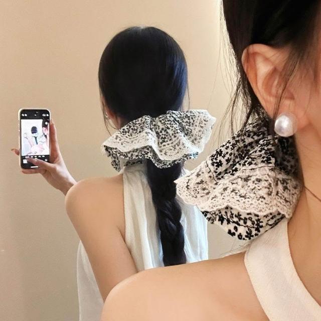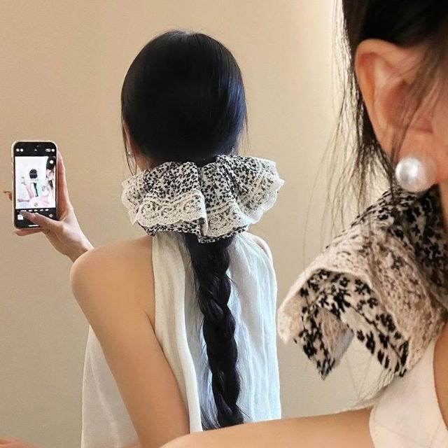 碎花裙襬~法式復古蕾絲黑色大腸髮圈女高級感發飾大號發繩新款春