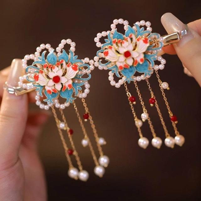 髮夾蓬鬆古風漢服旗袍新中式配飾燒藍貝珠花朵丸子頭邊夾流蘇髮飾
